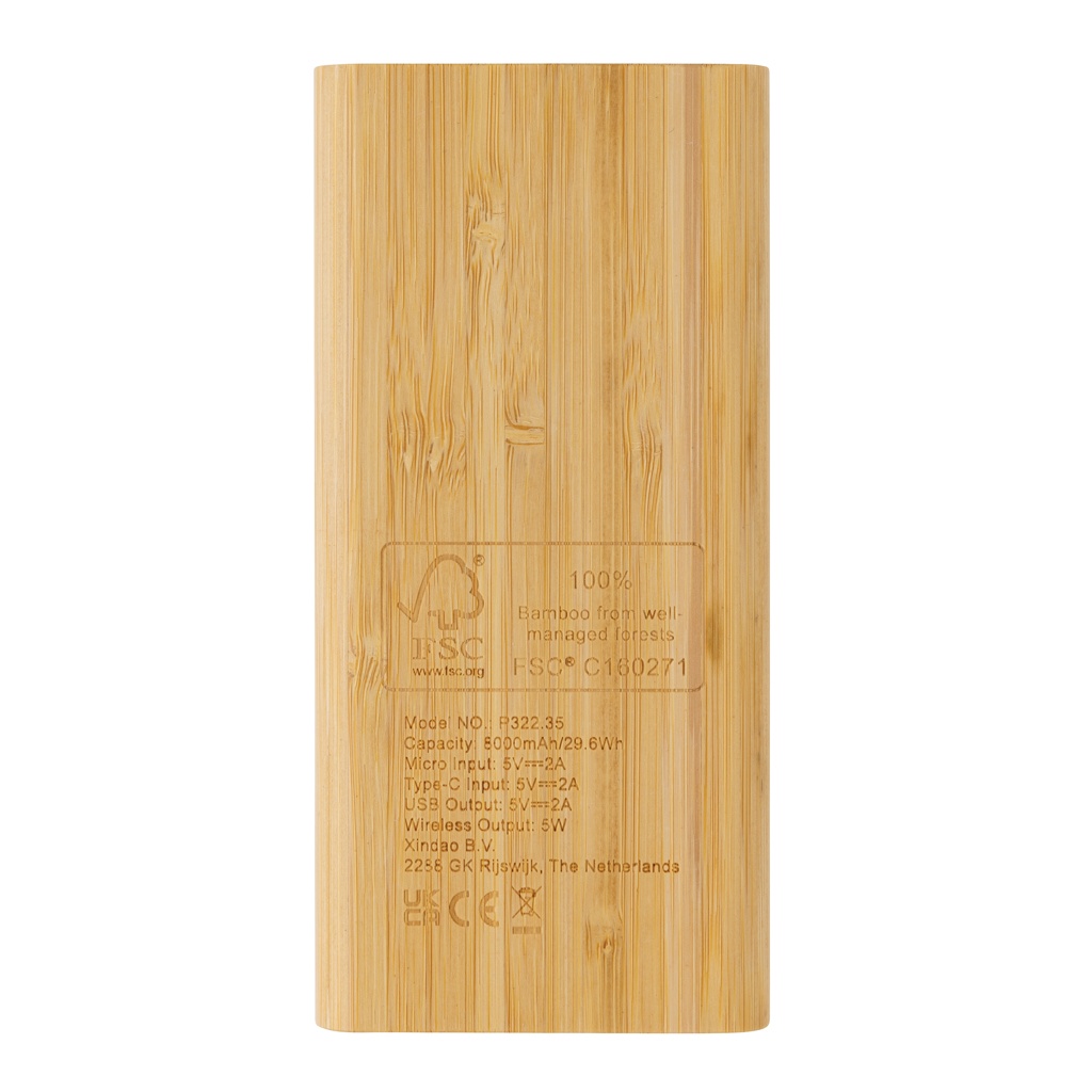 8.000mAh Powerbank mit Gehäuse aus 100% FSC®-zertifiziertem Bambus. Die Powerbank enthält einen langlebigen Lithium-Polymer-Akku der Klasse A mit 8.000 mAh. Die Powerbank unterstützt sowohl Laden per Kabel als auch kabelloses Laden mit 5W. Die Ladestandsanzeigen zeigen die verbleibende Energie an, sodass Sie immer wissen, wann Sie wieder aufladen müssen. Kabelloses Laden, kompatibel mit Android der neuesten Generation, iPhone 8 und höher. Input Mikro und Type-C, DC5V/2A; Output USB-A, Micro-USB und Type-C DC5V/2A; Wireless Output: 5V/1A. Inklusive PVC-freiem Ladekabel aus recyceltem TPE-Material. Artikel und Zubehör 100% PVC-frei. Verpackt in FSC®-Mix-Verpackung.
