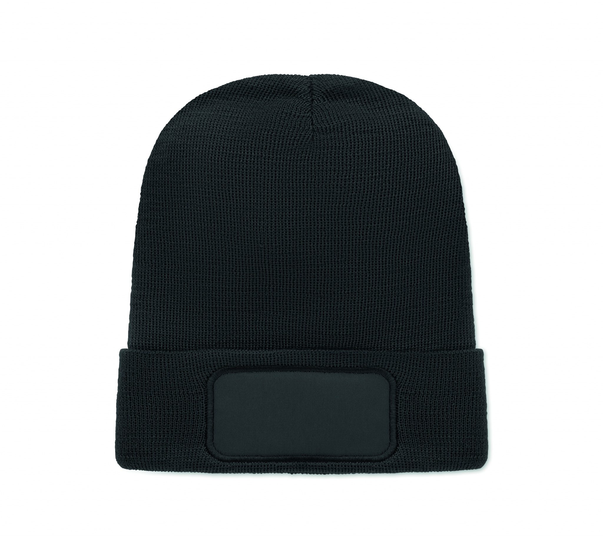 Beanie aus softem, elastischem RPET-Polyester. Mit Umschlag und Aufnäher. Unisex.
