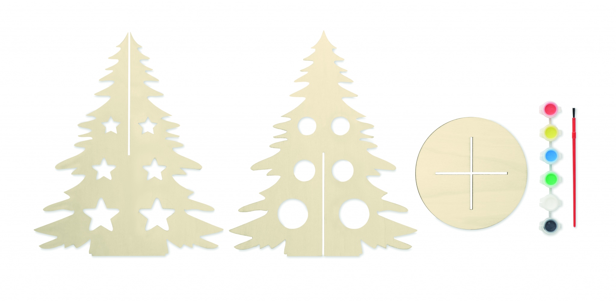 Weihnachtliche Dekoration aus Holz in Form eines Weihnachtsbaumes mit 6 Wasserfarben und Pinsel. Montage erforderlich.