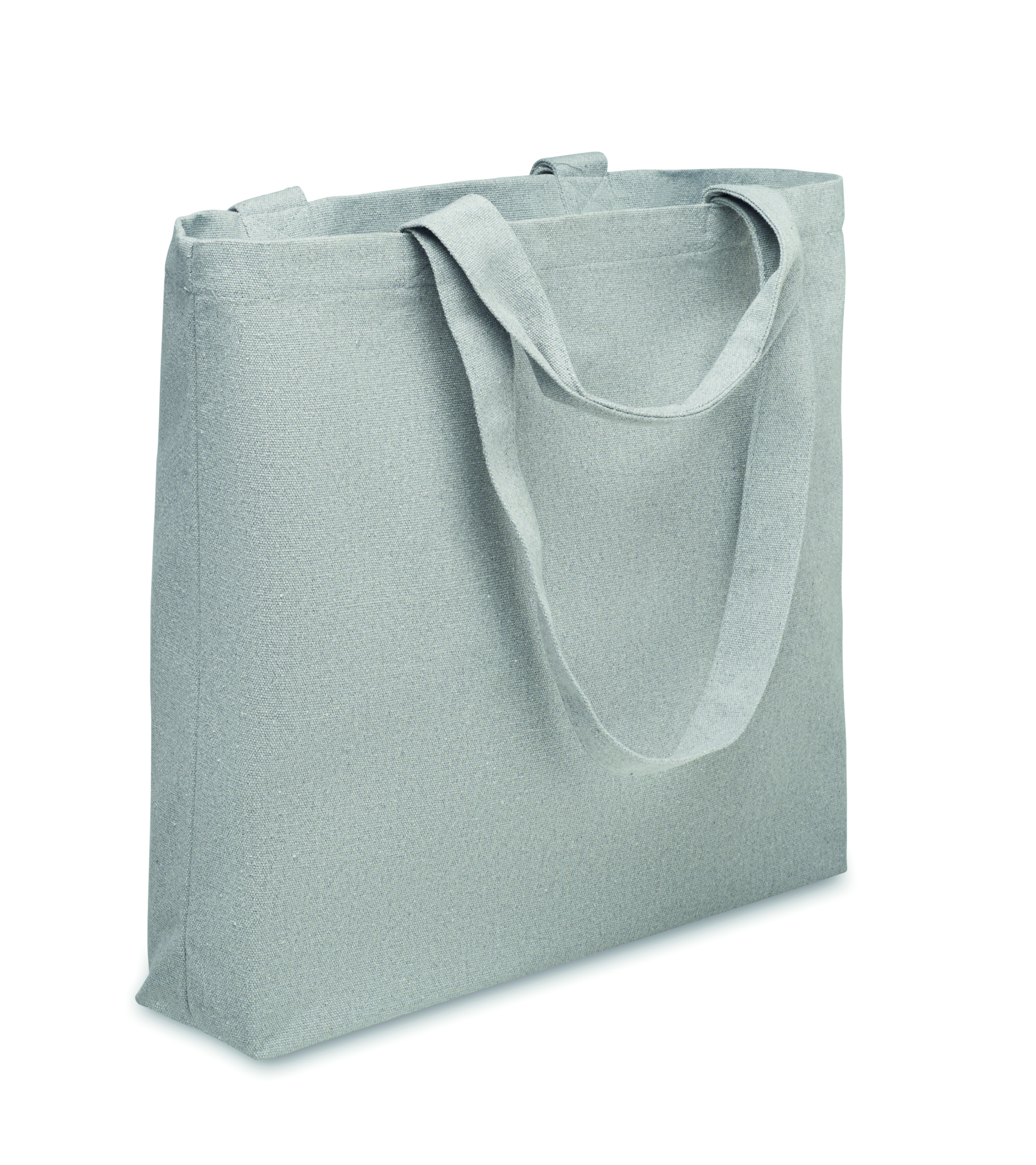 Einkaufs- oder Strandtasche aus recycelten Materialien (60 % recycelte Baumwolle, 40 % recycelter Polyester). Kurze und lange Tragegriffe. 320 g/m².