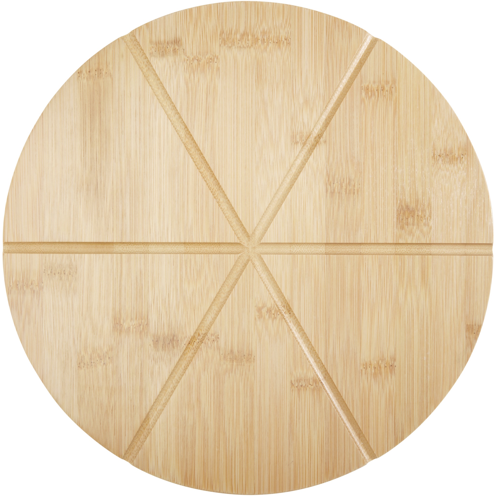 Pizzaplatte aus Bambus mit 6 Rillen zum Schneiden und Portionieren, ein Pizzaschneider und ein Pizzaservierer. Der verwendete Bambus wird nach nachhaltigen Normen beschafft und produziert.