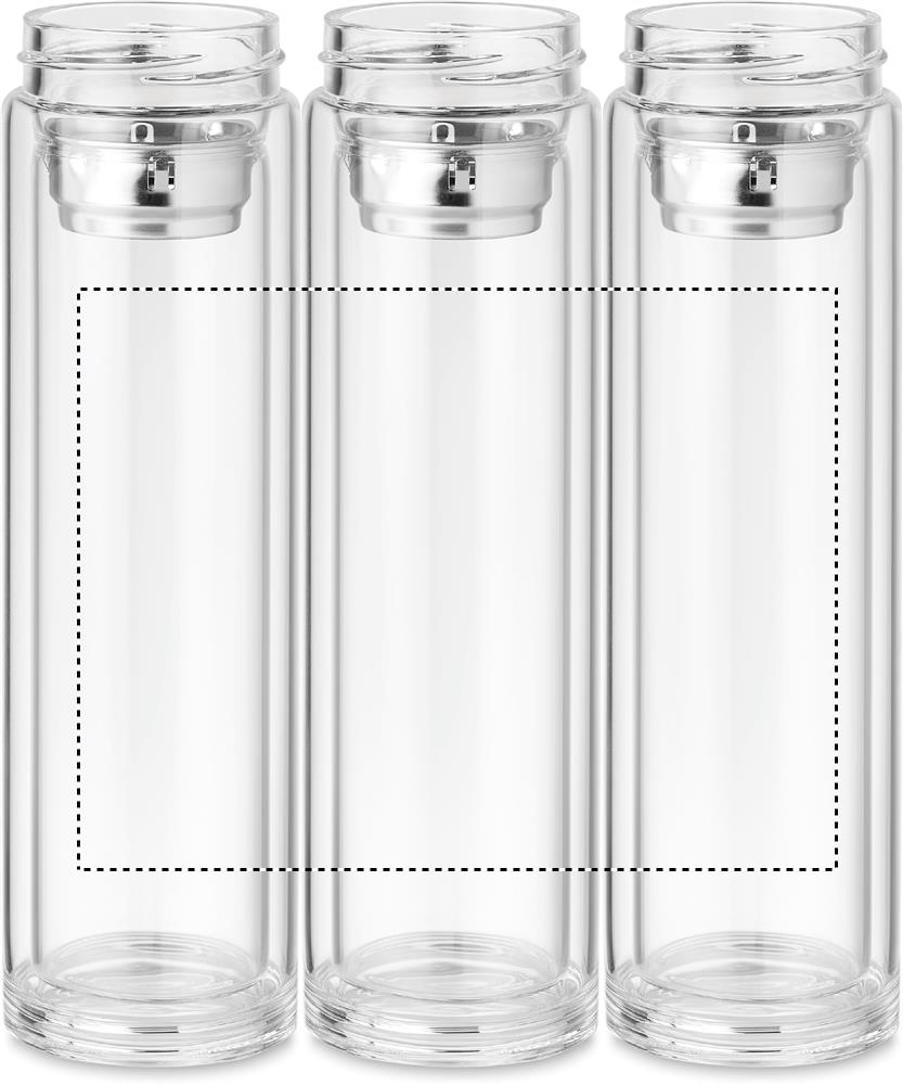 Doppelwandige Flasche aus Borosilikat-Glas. Mit Tee-Sieb. Im Deckel befindet sich eine integrierte Touchscreen LED Temperaturanzeige, die die Temperatur des Getränks anzeigt. Inkl. 1 austauschbare CR2032 - Batterie. Füllmenge: 390 ml. Auslaufsicher.