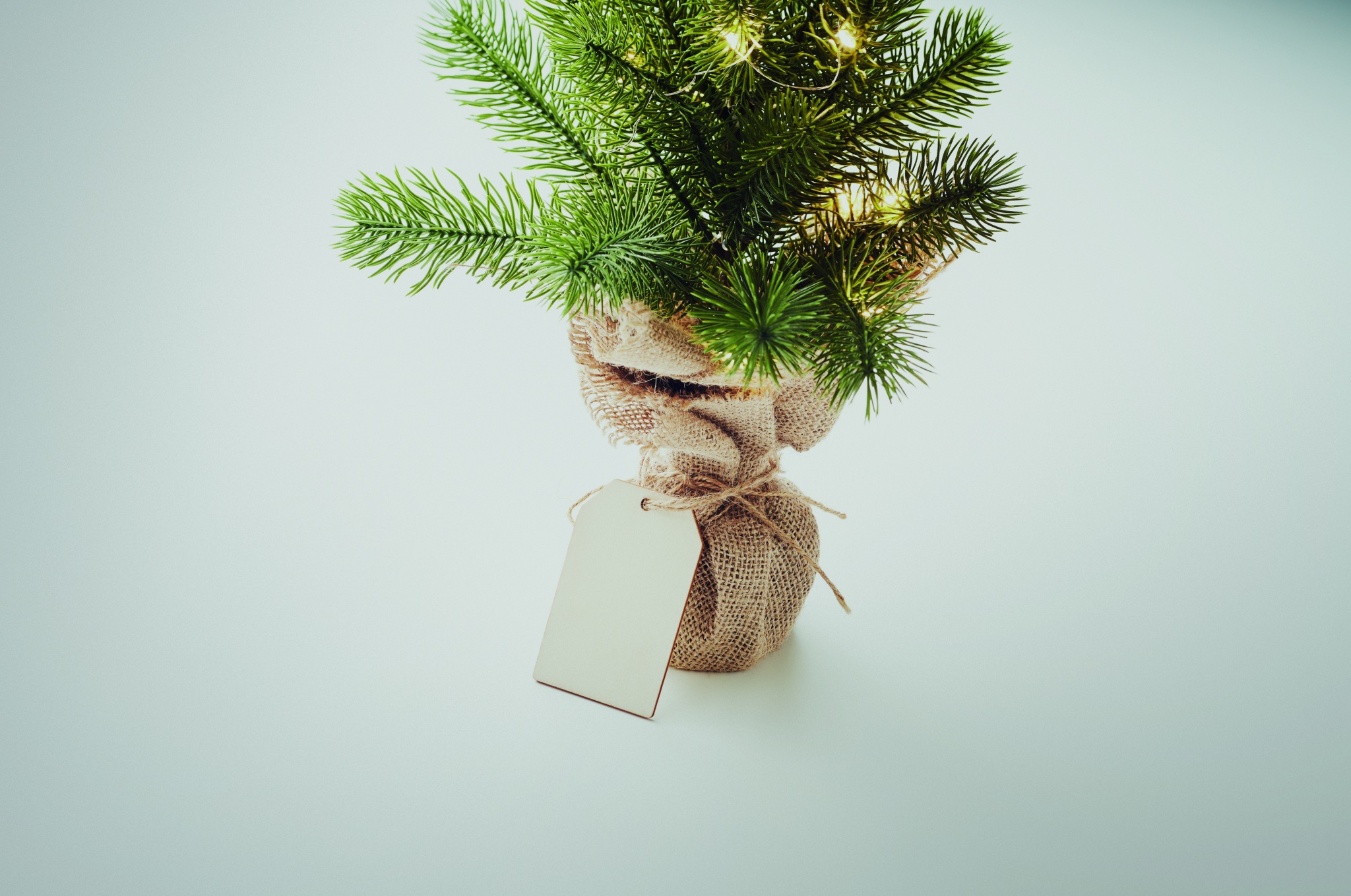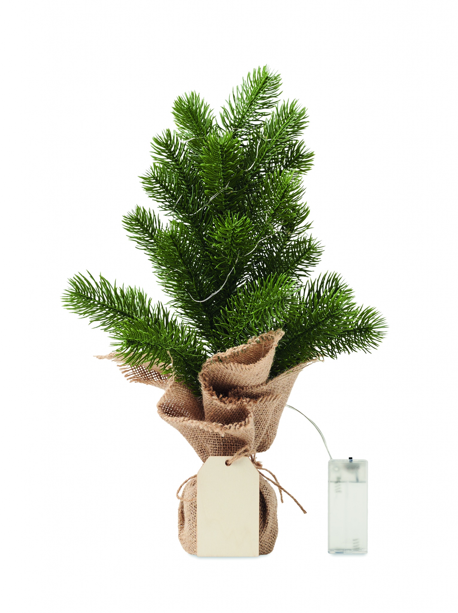Künstlicher Mini-Weihnachtsbaum (PE) mit 20 warmgelben LED-Lichtern. Ständer in Jute. Inkl. Geschenkanhänger aus Holz. Exkl. 2 AA Batterien.