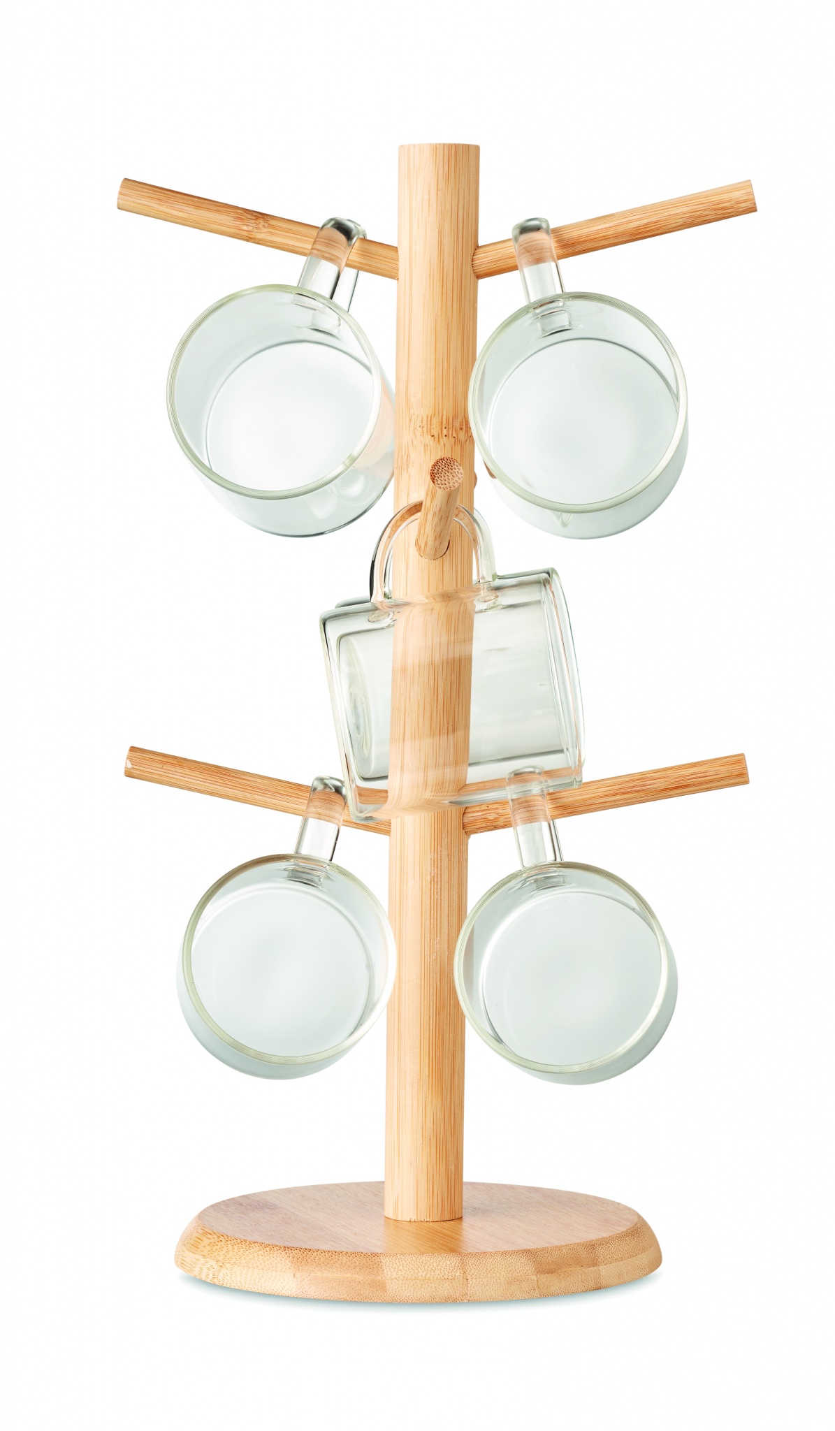 Tassenbaum aus Bambus mit 6 Bechern aus Borosilikatglas. Fassungsvermögen: 200 ml pro Becher. Produktmontage erforderlich. Bambus ist ein natürliches Produkt, es kann daher zu leichten Abweichungen in Farbe, Dekor und Maßen kommen.