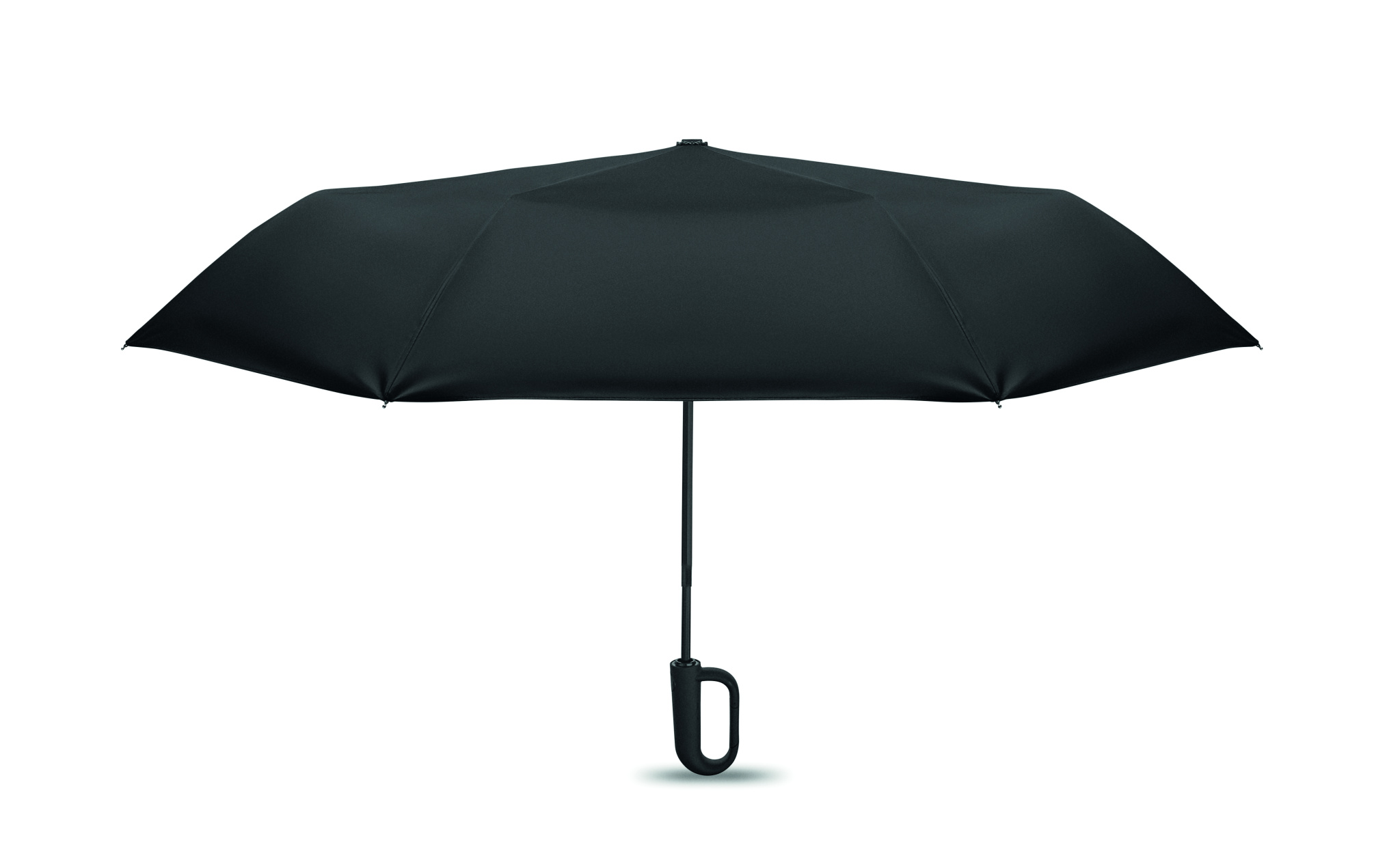 21'' Regenschirm aus 190 T RPET Pongee. Windbeständig. Schwarz überzogenes 2-teiliges Fiberglasgestell, Stangen aus Fiberglas. Gummierter D-förmiger Karabinergriff. Passende Schirmhülle. Automatische Öffnung und Schließung.