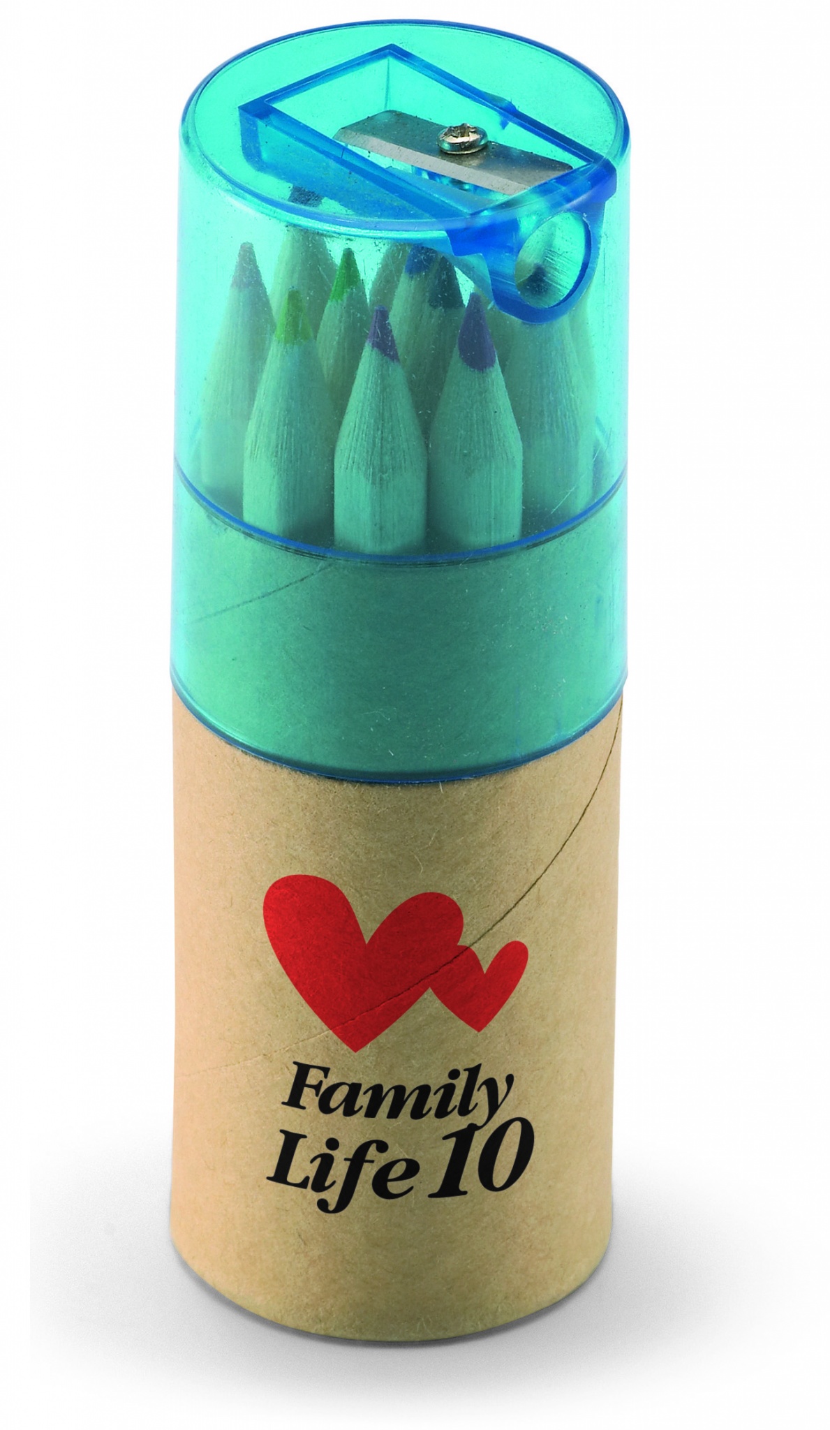 12 piece colouring pencils in tube. Pencil sharpener transparent lid.