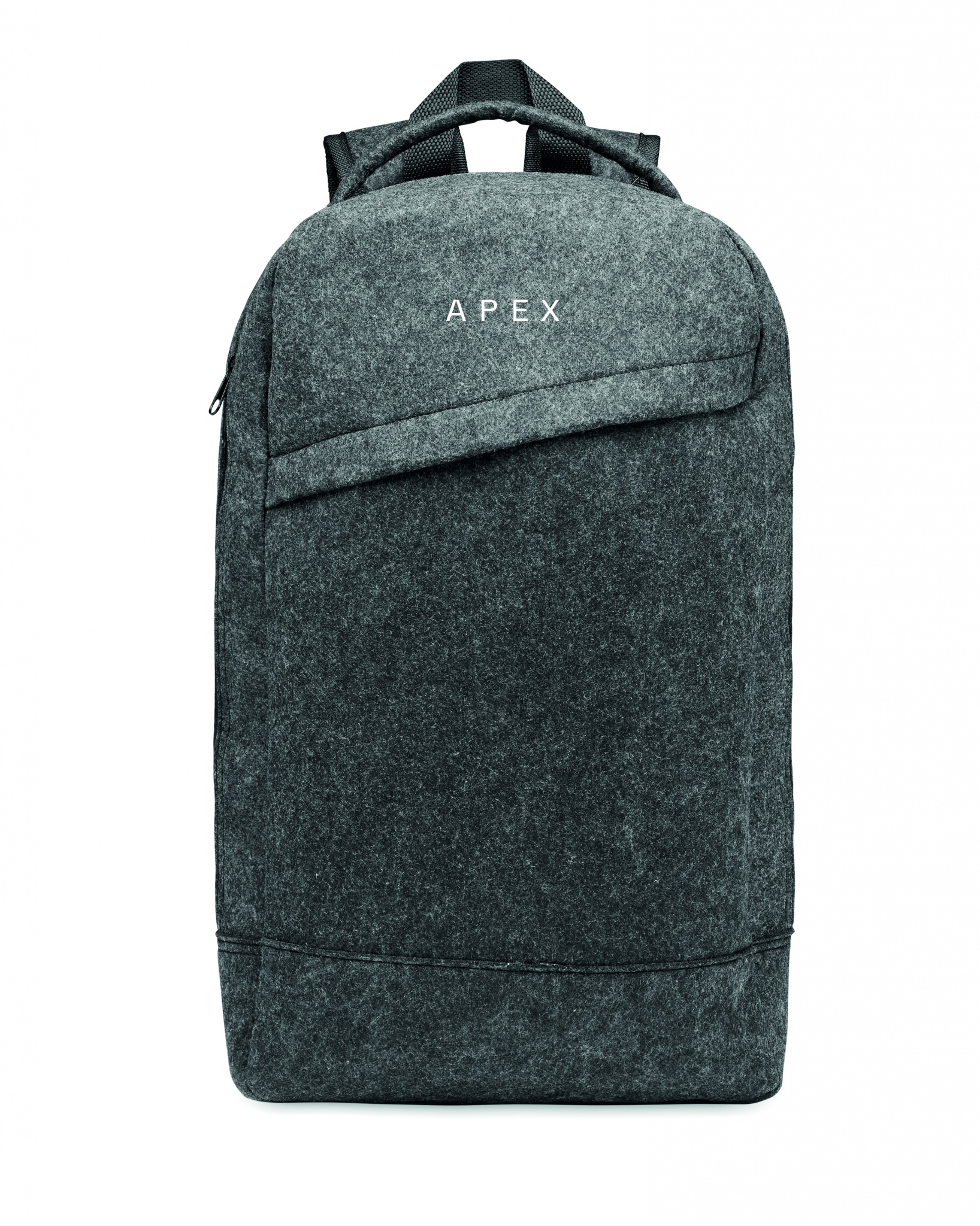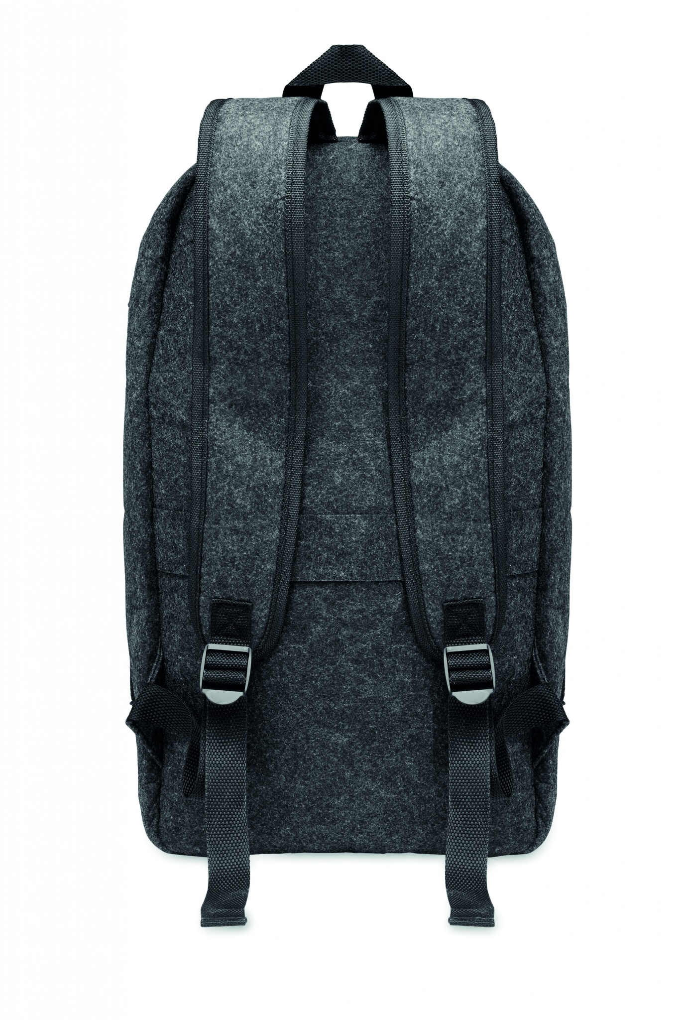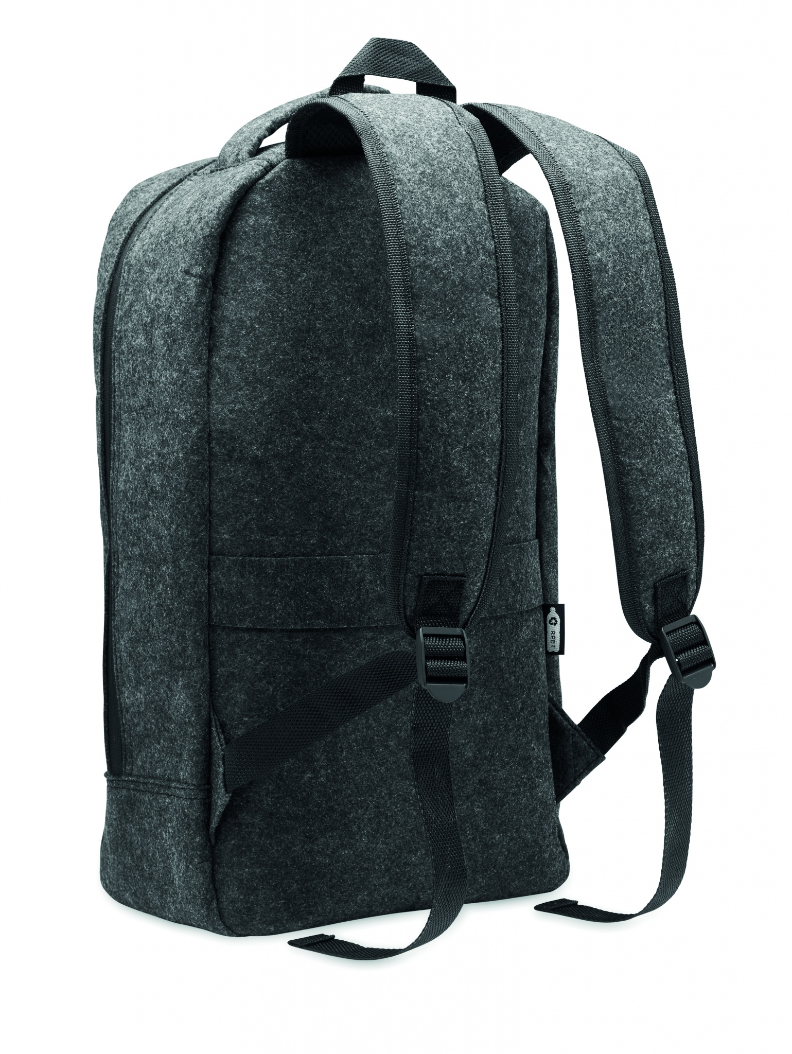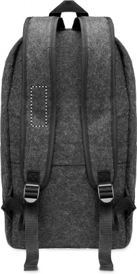 13 inch laptop backpack in RPET felt with padded shoulder and strap with a main internal compartment. Zippered compartment inside. Trolley holder on reverse side.
