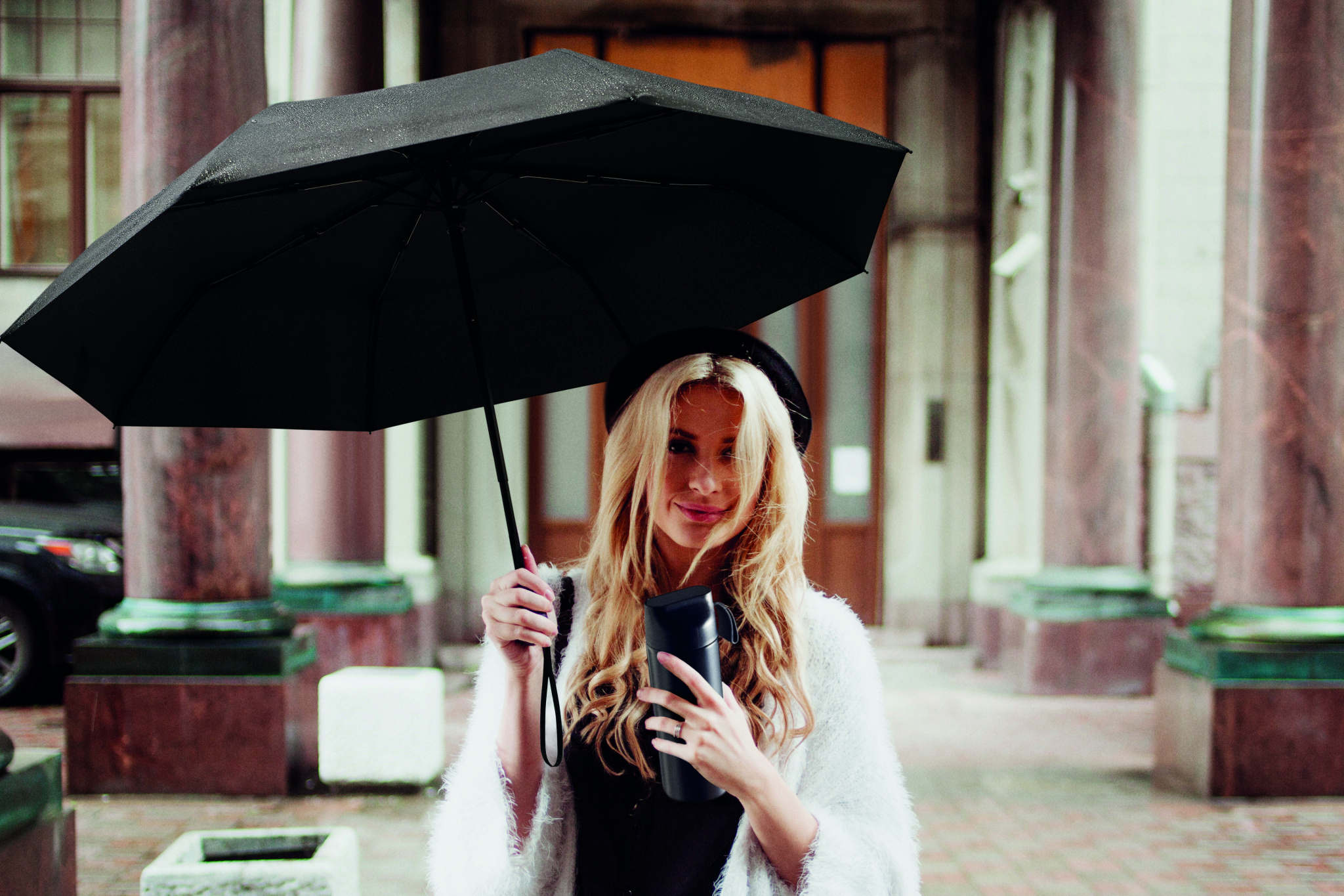 "2-piece gift set with 600 ml double wall recycled stainless steel bottle with PP lid, metal detail, and silicone handle, plus 21"" foldable windproof pongee umbrella with ABS handle in gift box."