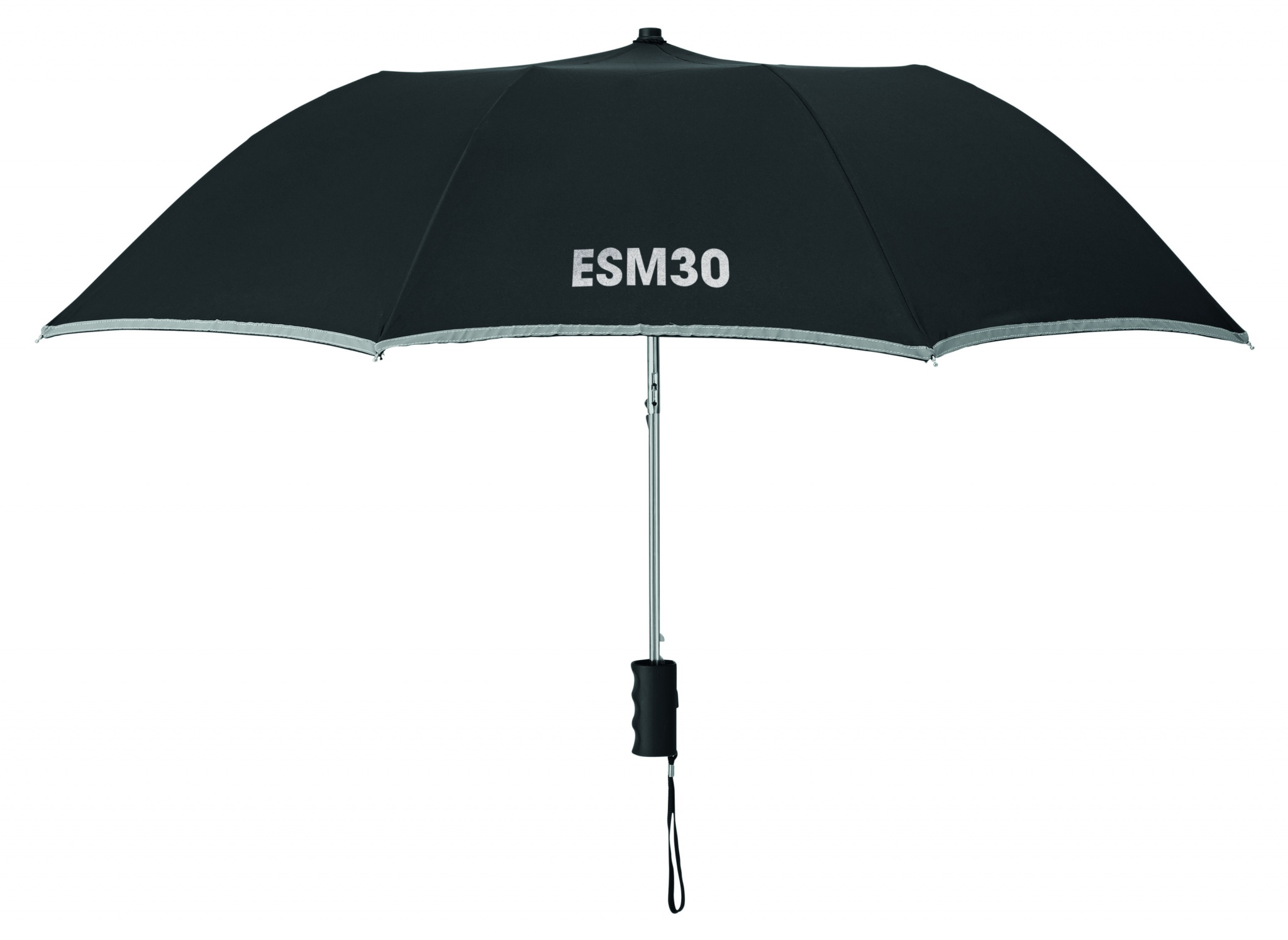 21 inch 2 fold auto open umbrella in 190T pongee with zincify plating steel shaft, ribs and tips. Panels with reflective trim. Black plastic handle with wrist strap. Includes matching pouch with reflective trims. Manual closure.