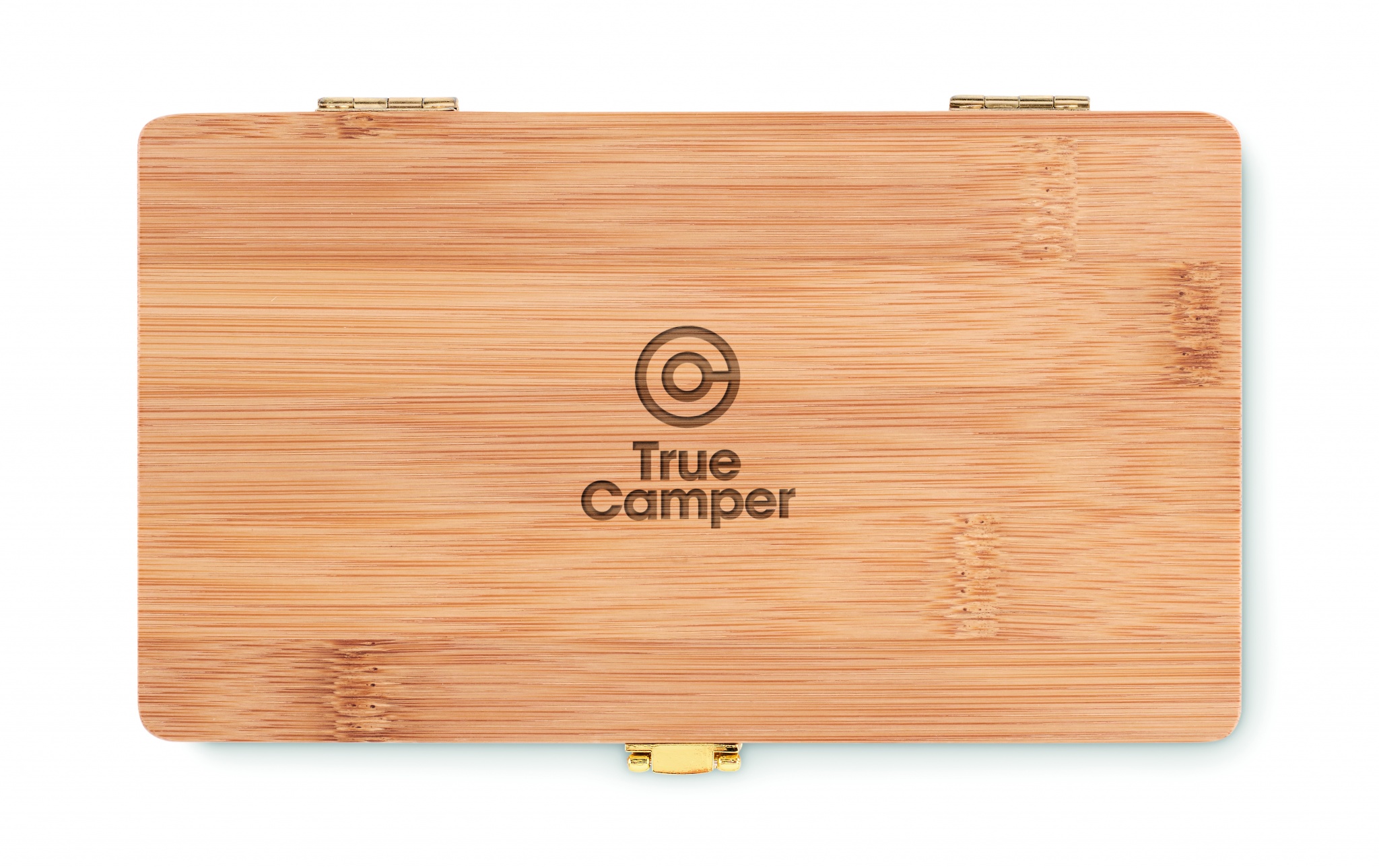 Tool set presented in a bamboo case containing 3 screwdrivers, 10 bits in holder, 3 slotted sizes, 3 Torx sizes and 1 adapter, 4 sockets , 1pc cutter, 1 handle and 1 connector. Bamboo is a natural product, there may be slight variations in colour and size per item, which can affect the final decoration outcome.