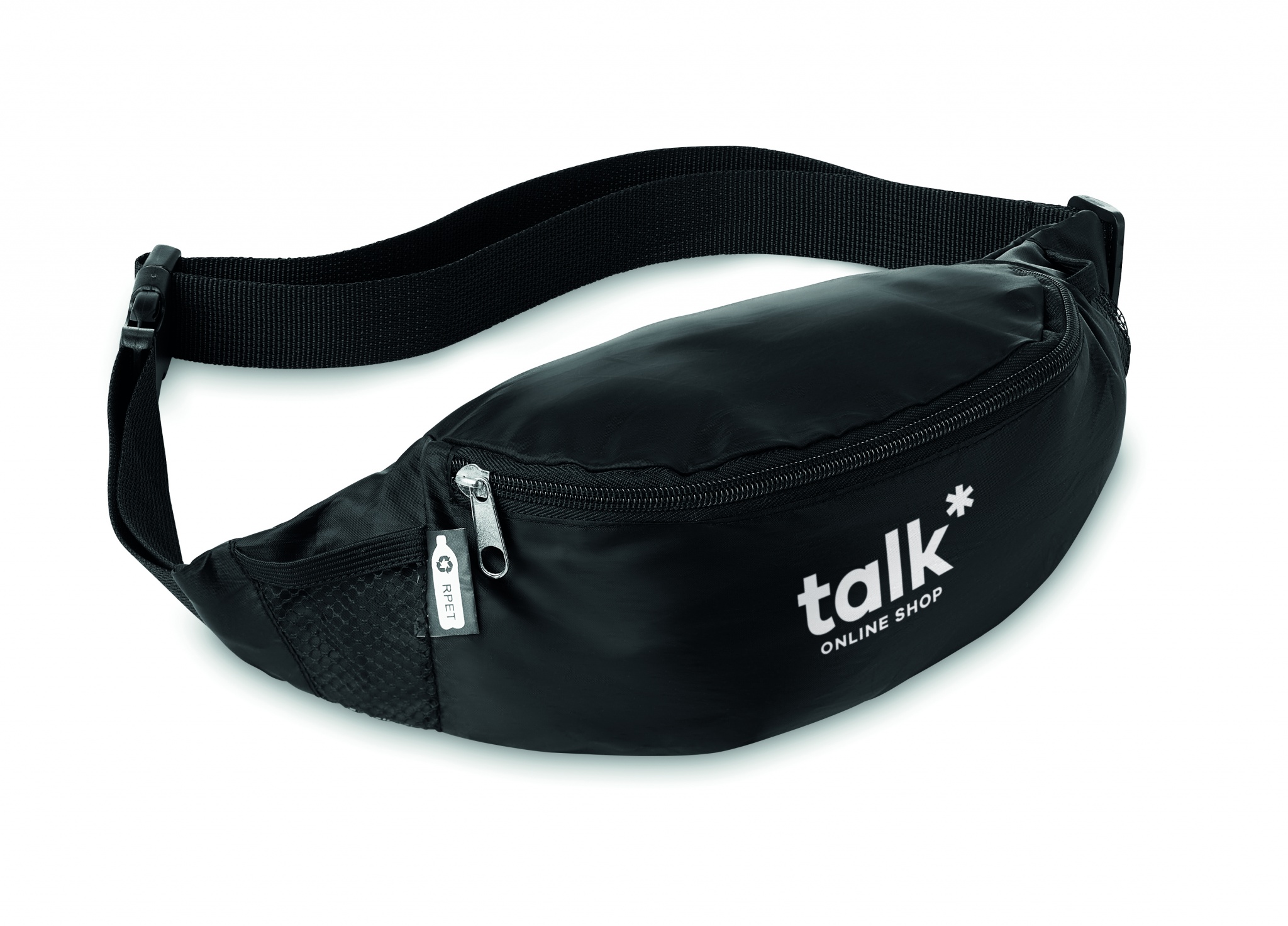 Fanny bag in 210D RPET with zippered main compartment and adjustable waist strap.