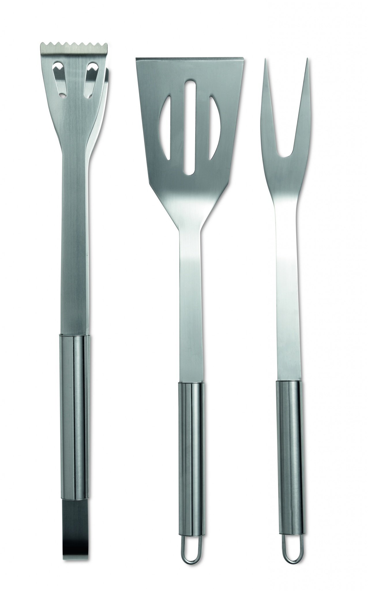Set of 3 stainless steel barbecue tools in nonwoven pouch with zipper.