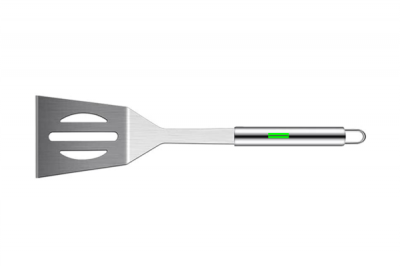 3 pcs stainless steel barbecue set including, spatula, carving fork with protection cover and pair of tongs, stainless steel handles. Packed in aluminium case with handle and hinges.