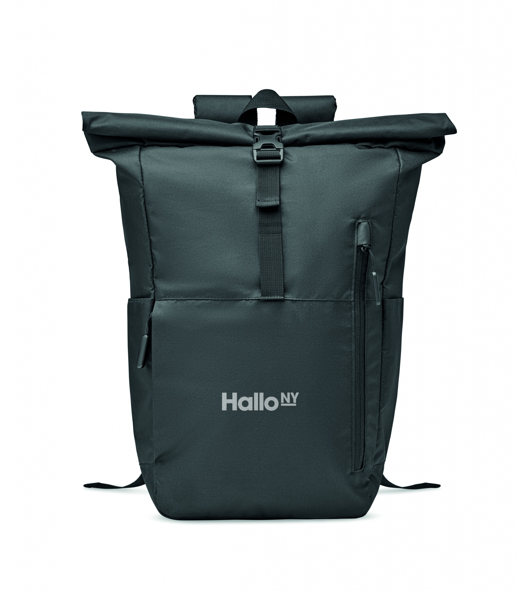 15 inch rolltop laptop backpack in 300D RPET polyester. Large zippered front pocket, hidden side pocket with small carabineer loop inside. The carabiner is not for climbing (non professional use).