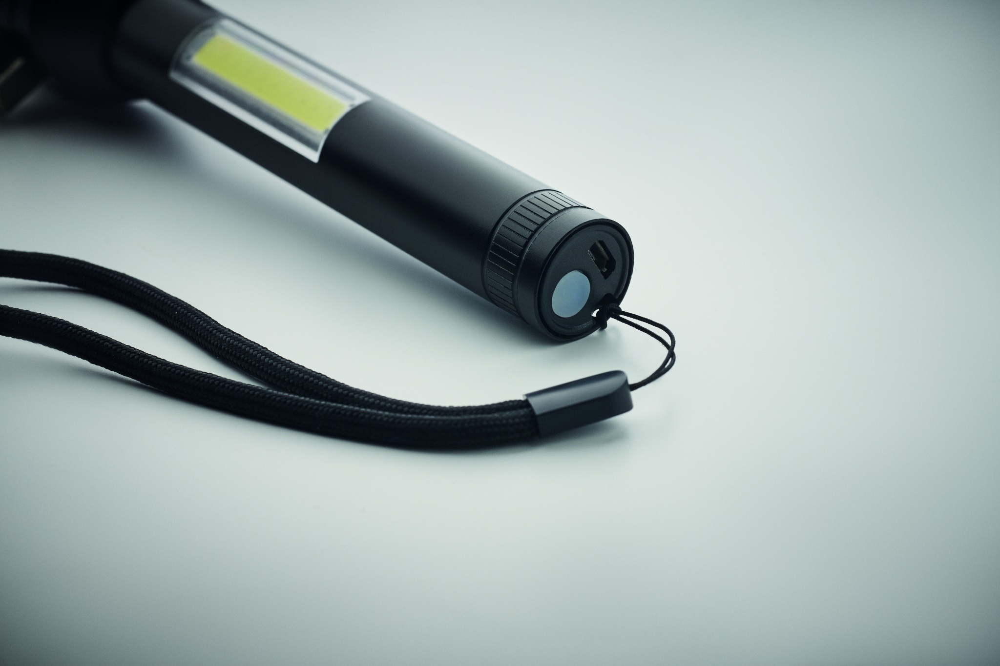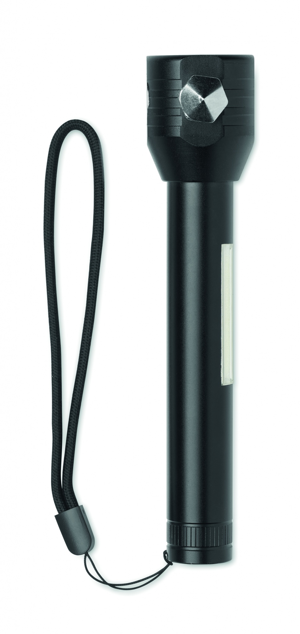 3 in 1 aluminium torch with emergency hammer and seat belt cutter. It has a COB light on side and front. Including magnet and hand strap. Built-in rechargeable 500mAh battery included.