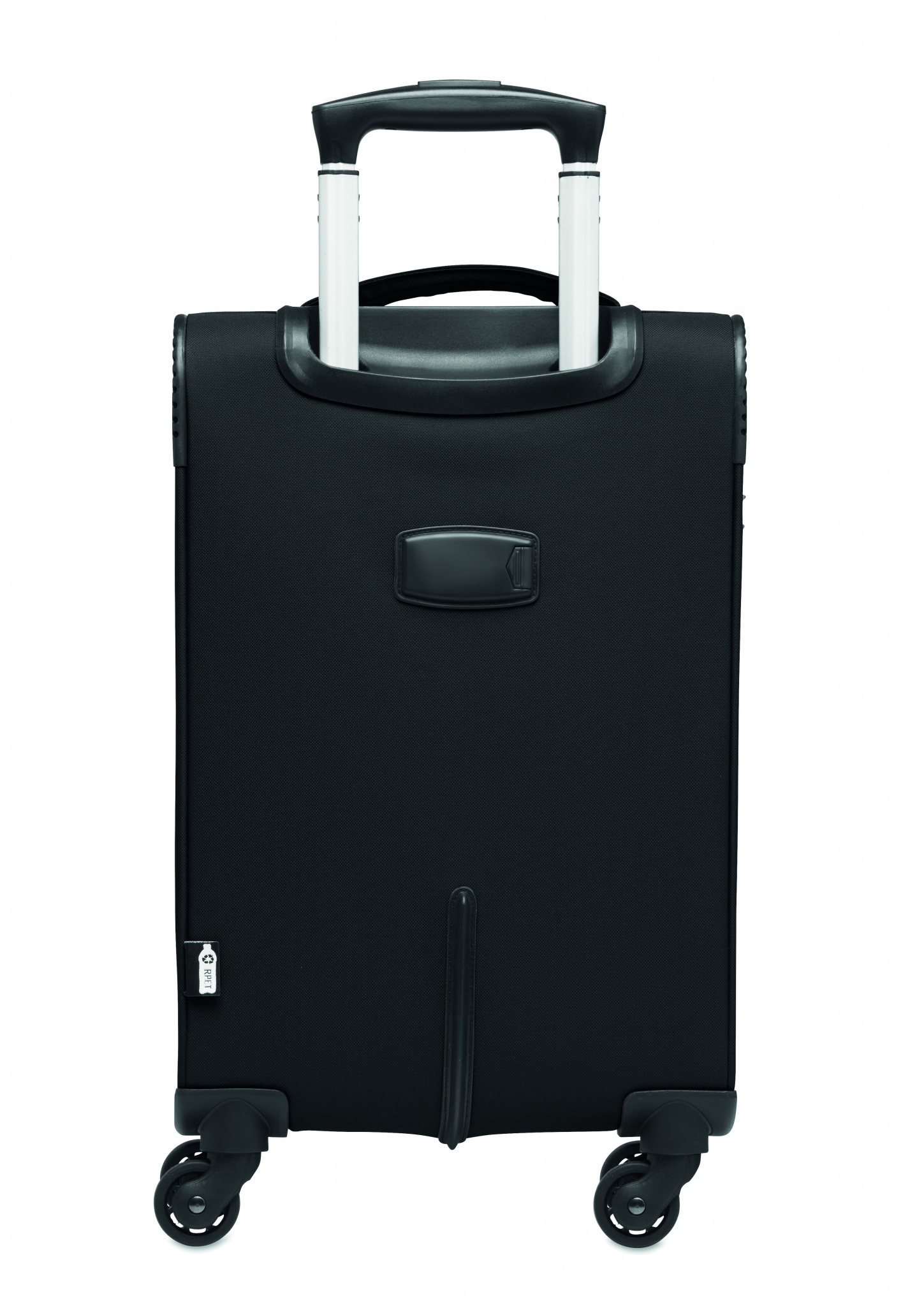 600D RPET Polyester soft side cabin trolley. Including exterior zipped laptop compartment. Zipped front pocket. Combi lock. Bottom compartment with ribbons.