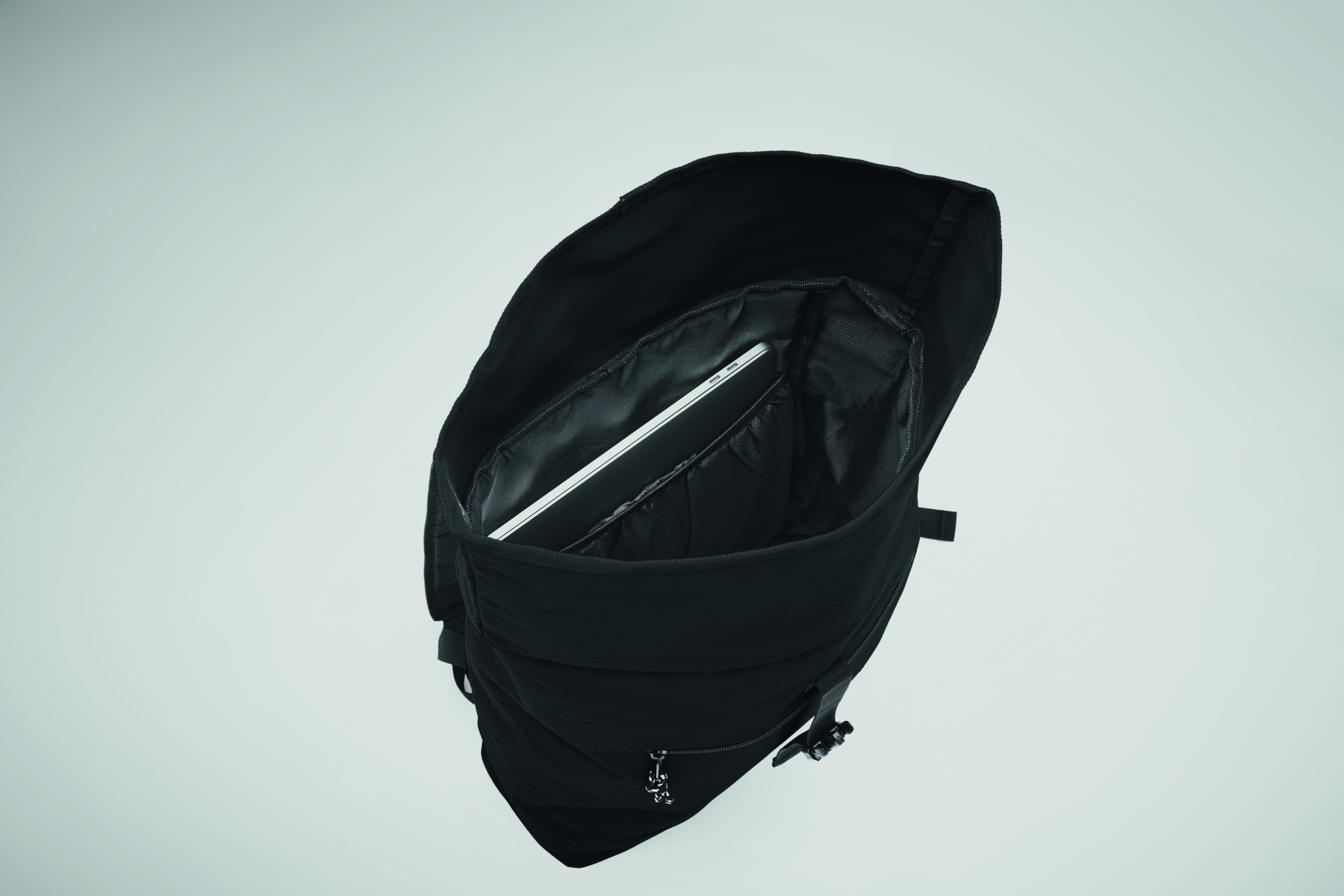 15 inch rolltop laptop backpack in 600D polyester with padded back and base reinforcement. Zippered front pocket. 210D lining.
