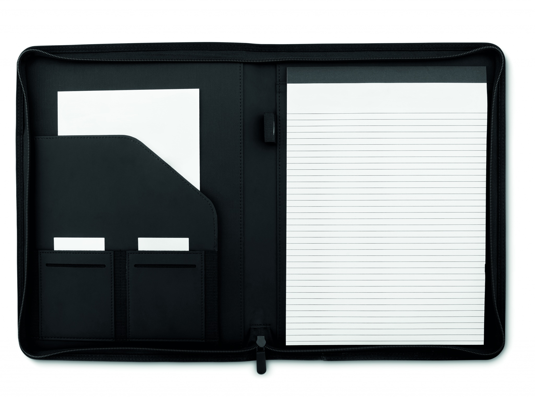 A4 conference folder in two-toned polyester. Zipped. 20 lined pages notepad. 3 compartments. Pen holder.