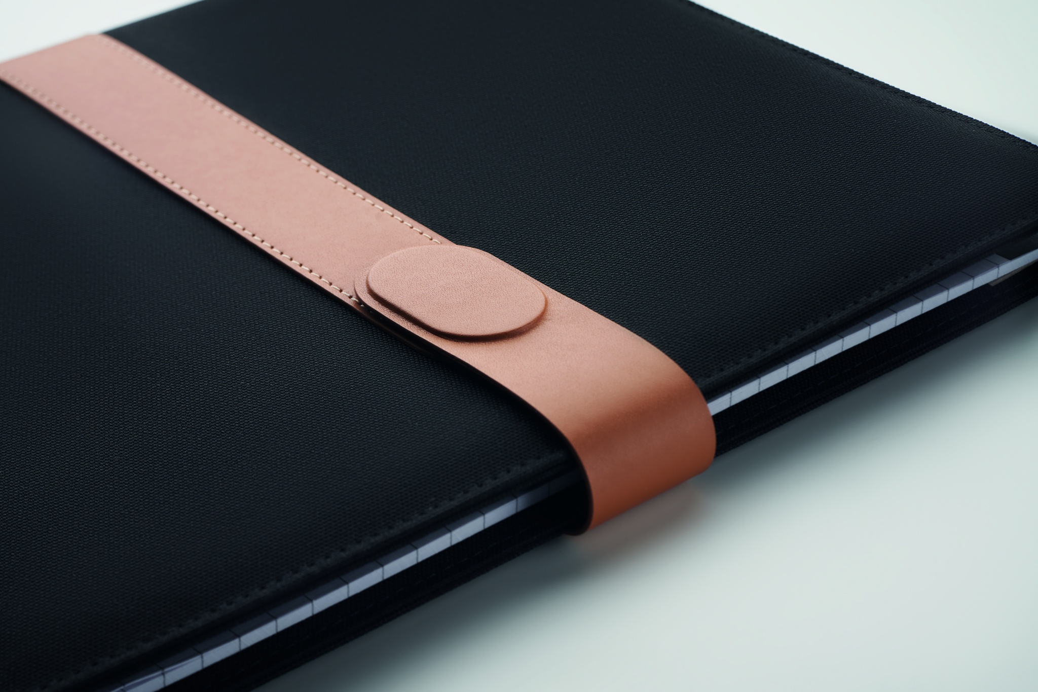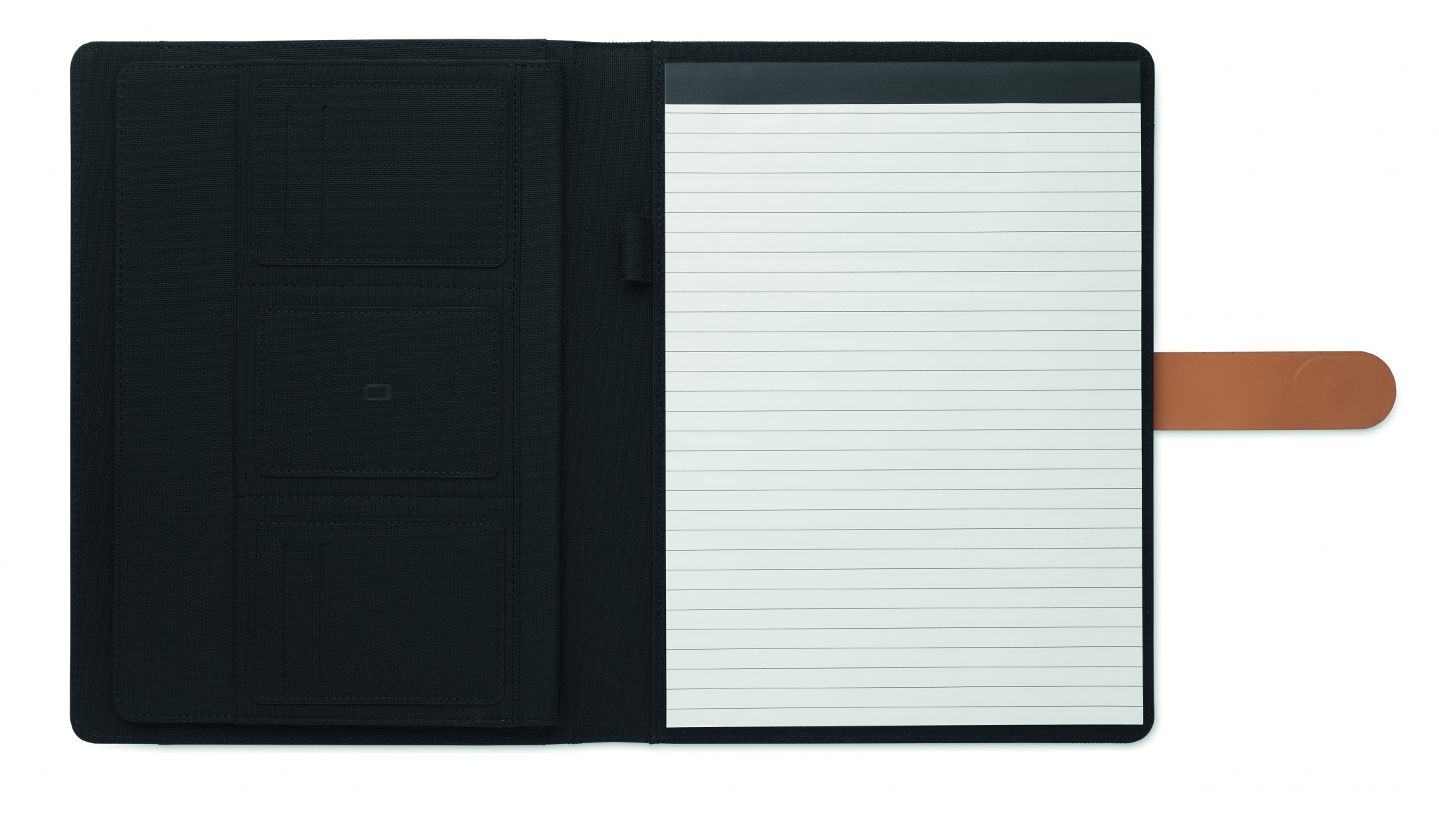 A4 portfolio in RPET with faux leather details. Replaceable A4 notepad.30 recycled paper lined pages. Pen holder. 4 cardholders, 3 small pockets and one big compartment. Magnetic strap closure.
