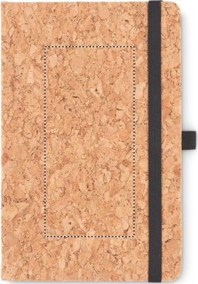 A5 cork notebook with matching pen. Hard cork cover. Casebound. 160 lined pages (80 sheets). Elastic closure strap and pen holder. Matching push button ball pen with cork barrel and 50% wheat straw and 50% PP details. Presented in a gift box. Cork is 100% natural material. Due to its structural nature and surface porosity the final print result per item may have deviations.