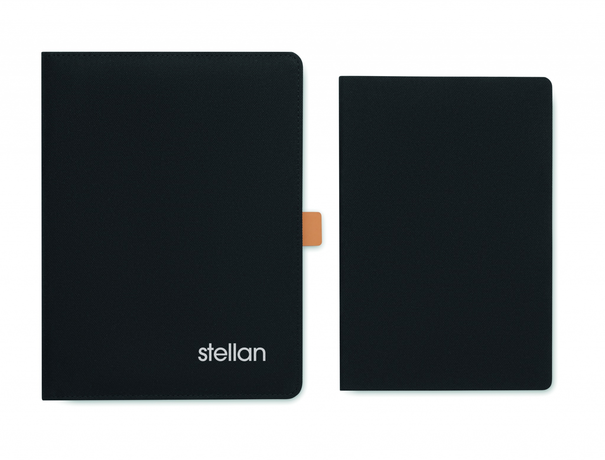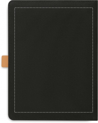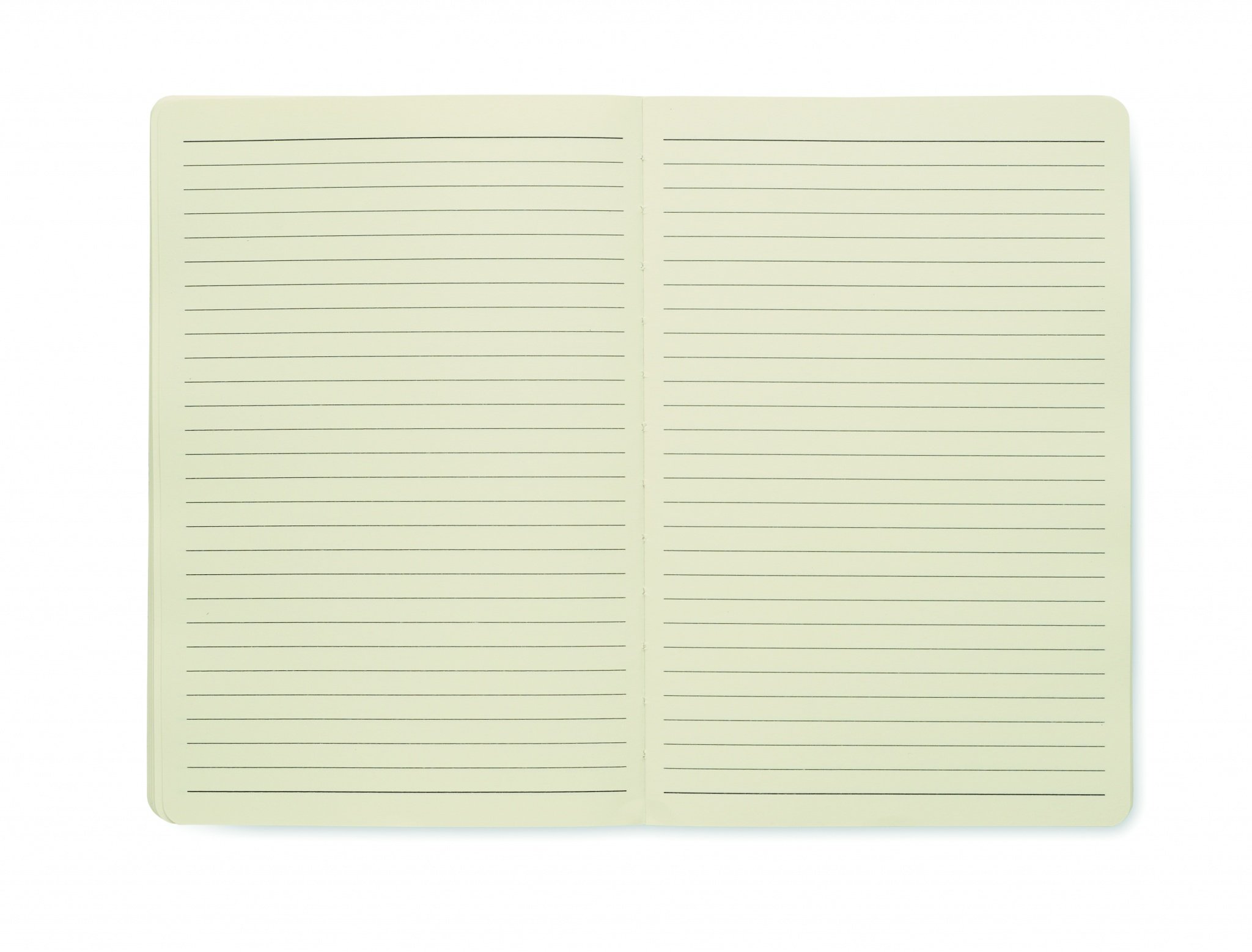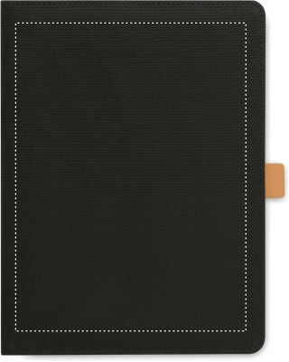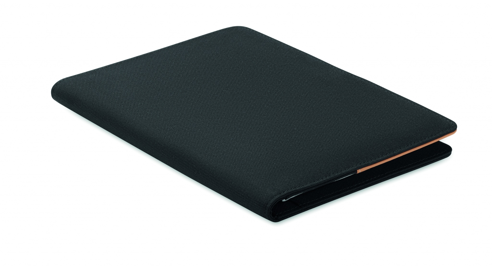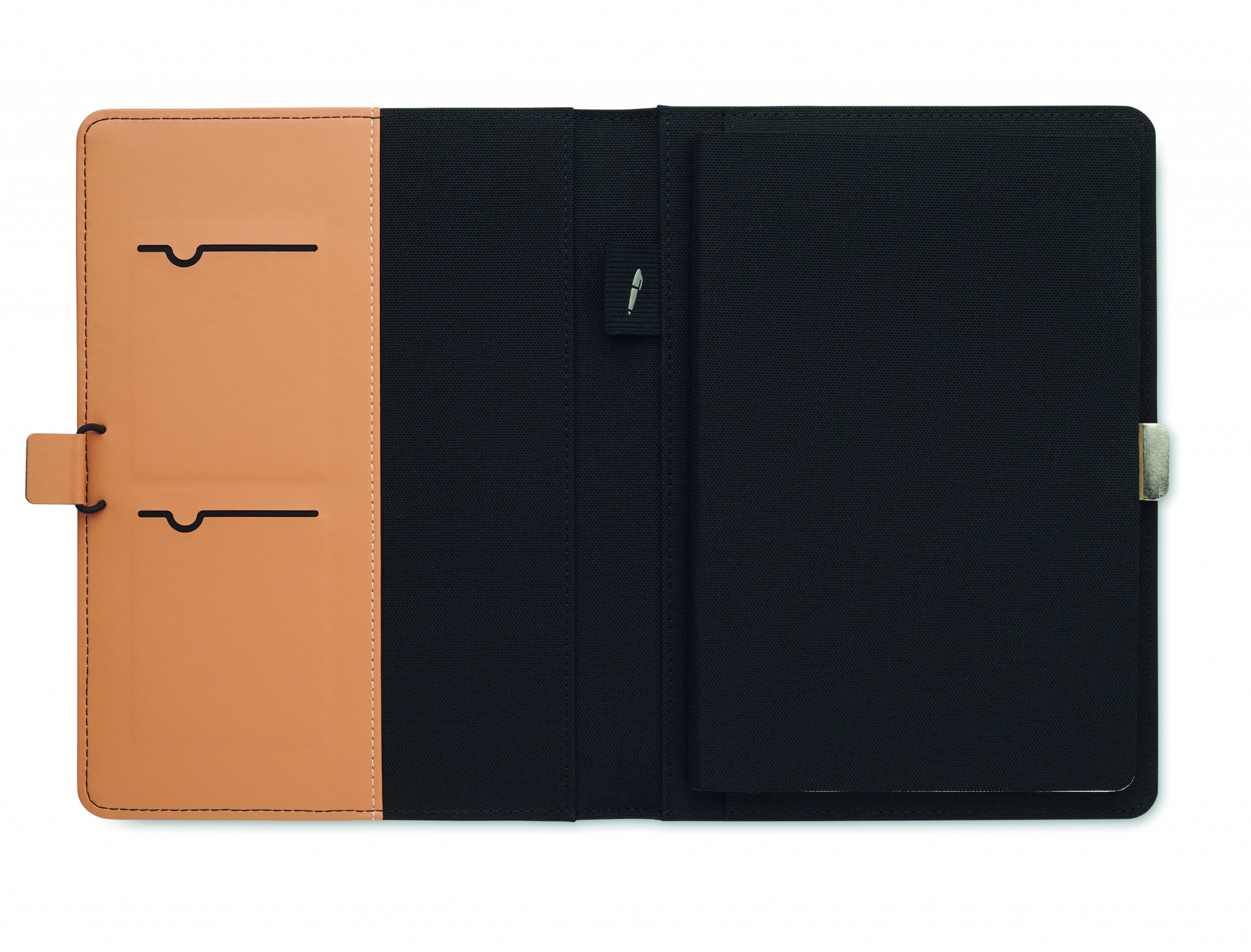 A5 portfolio in RPET with faux leather details. Replaceable A5 notebook with hard cork cover. Case bound. 128 recycled paper lined pages (64 sheets). Pen holder. 2 cardholders and one big compartment. Elastic closure strap with metal detail.