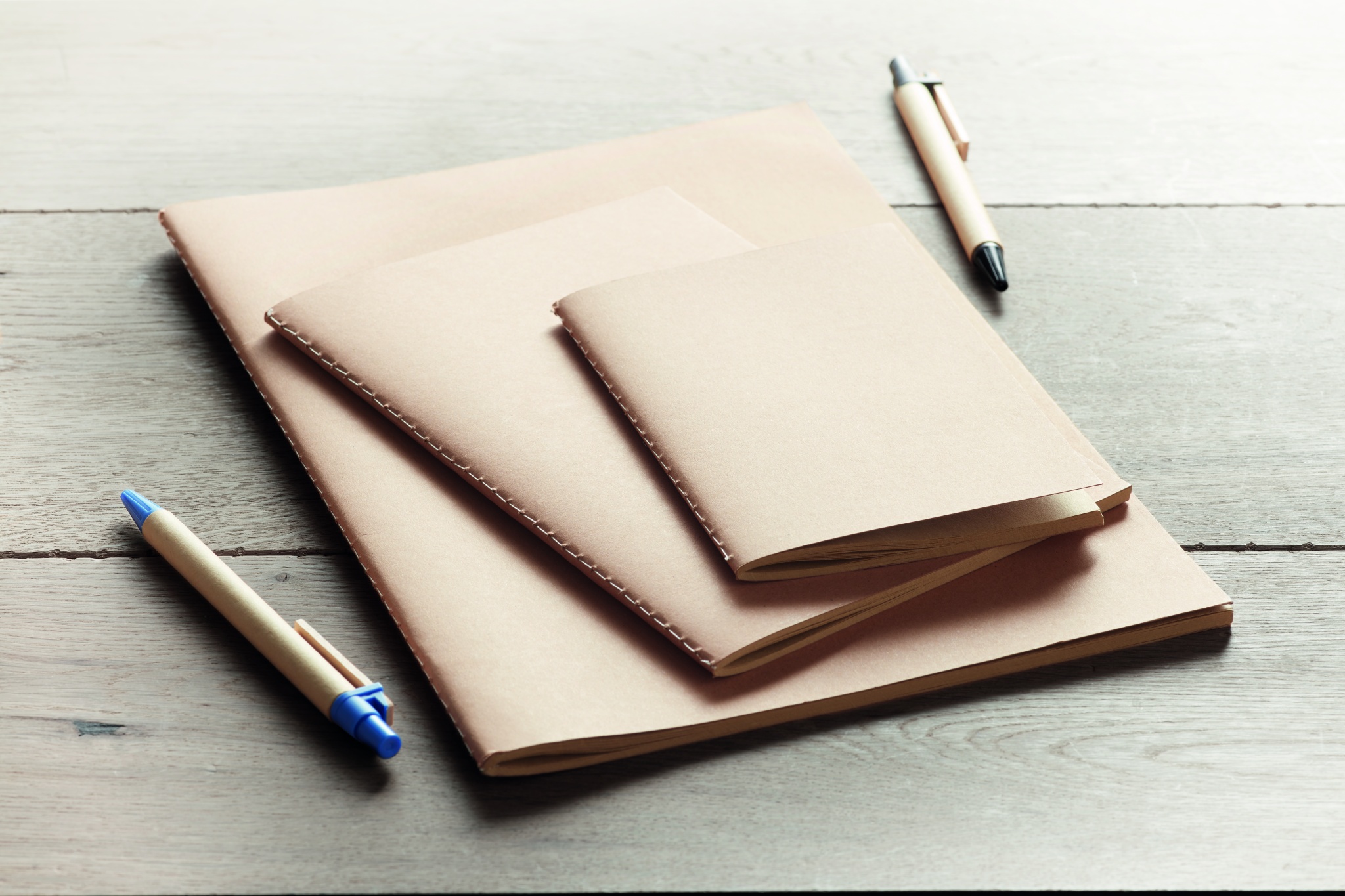 A6 recycled carton cover notebook. Sewn. 160 plain recycled paper pages (80 sheets).