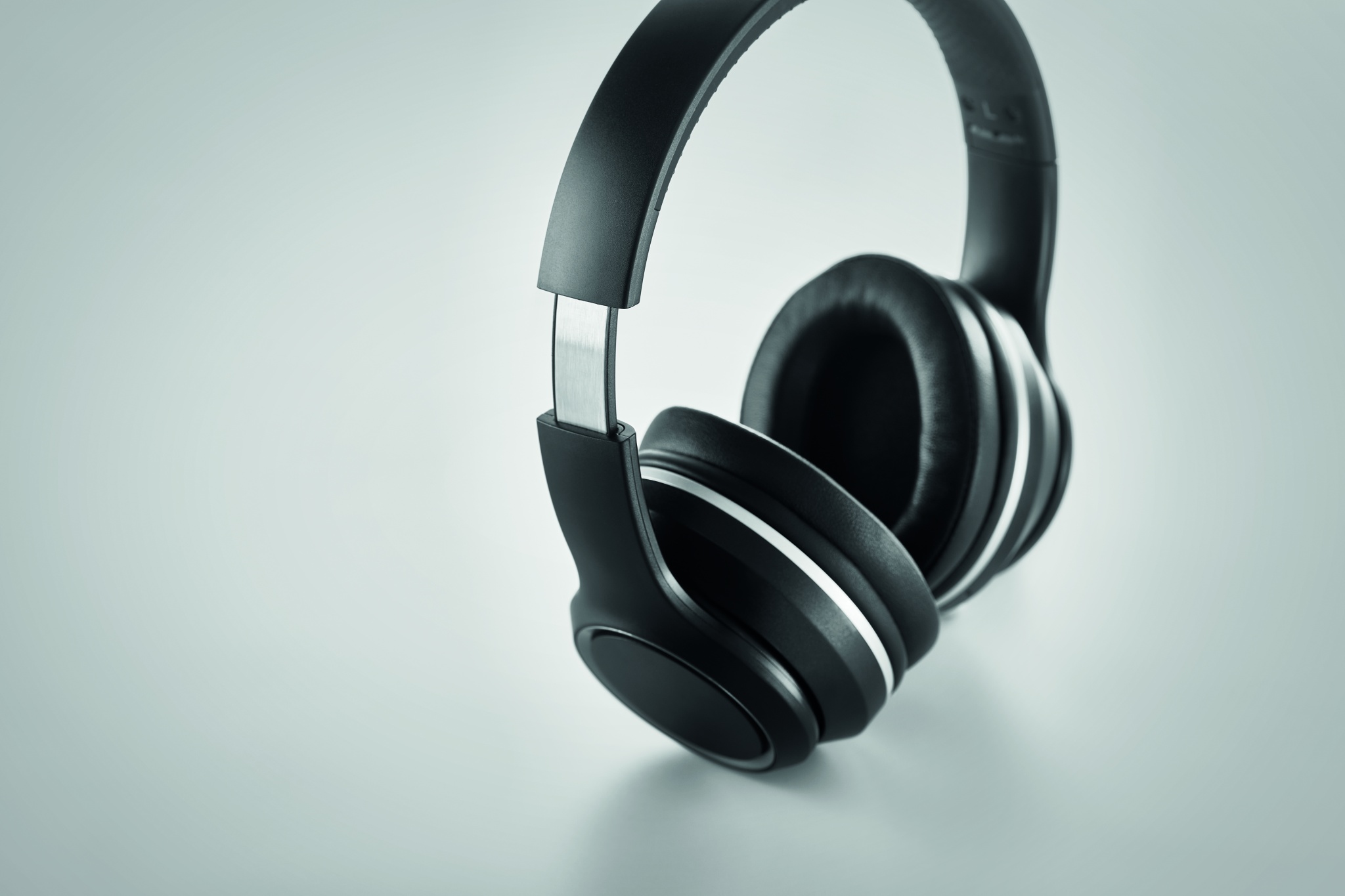 Active noise cancelling (ANC) foldable wireless 5.0 headphone in ABS. Rechargeable Li-ion battery 500 mAh. Hands free function and microphone built in. Playing time approx. 17 hours. Includes micro USB charging cable. All presented in PU pouch. Operating range: 10 m.