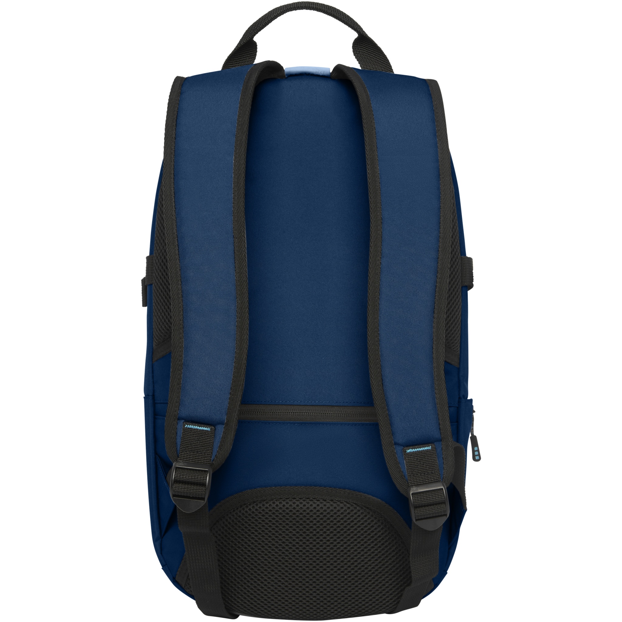 Sustainable GRS certified RPET laptop backpack made with 50% recycled materials. Features a large zippered main compartment with a padded 15" laptop sleeve with velcro closure, a hanging hook, and a front vertical zippered compartment. Comes with additional straps with buckle closure for safety, comfortable padded shoulder straps, grab handle, mesh back with a zippered pocket and expandable mesh side pocket.