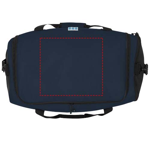 Sustainable GRS certified RPET duffel bag made with 55% recycled materials. Features a large zippered main compartment, a reinforced base panel, a side mesh pocket, and an expandable wet/dry zippered pocket. Comes with a small zippered internal pocket for organization, removable and padded shoulder strap, grab handles with padded velcro closure, and an extra grab handle on the bottom right side.