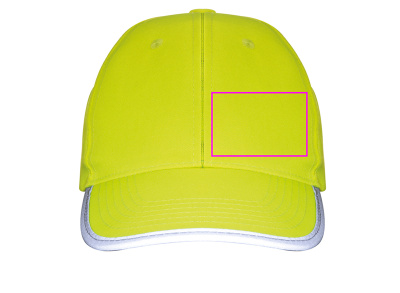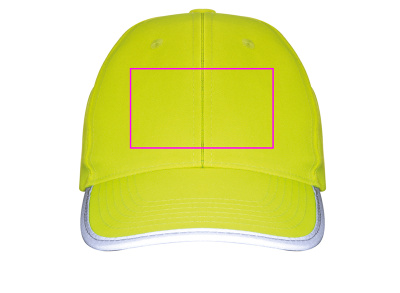 Baseball cap made of polyester with reflective piping on the visor. We print your logo on the center of the forehead.