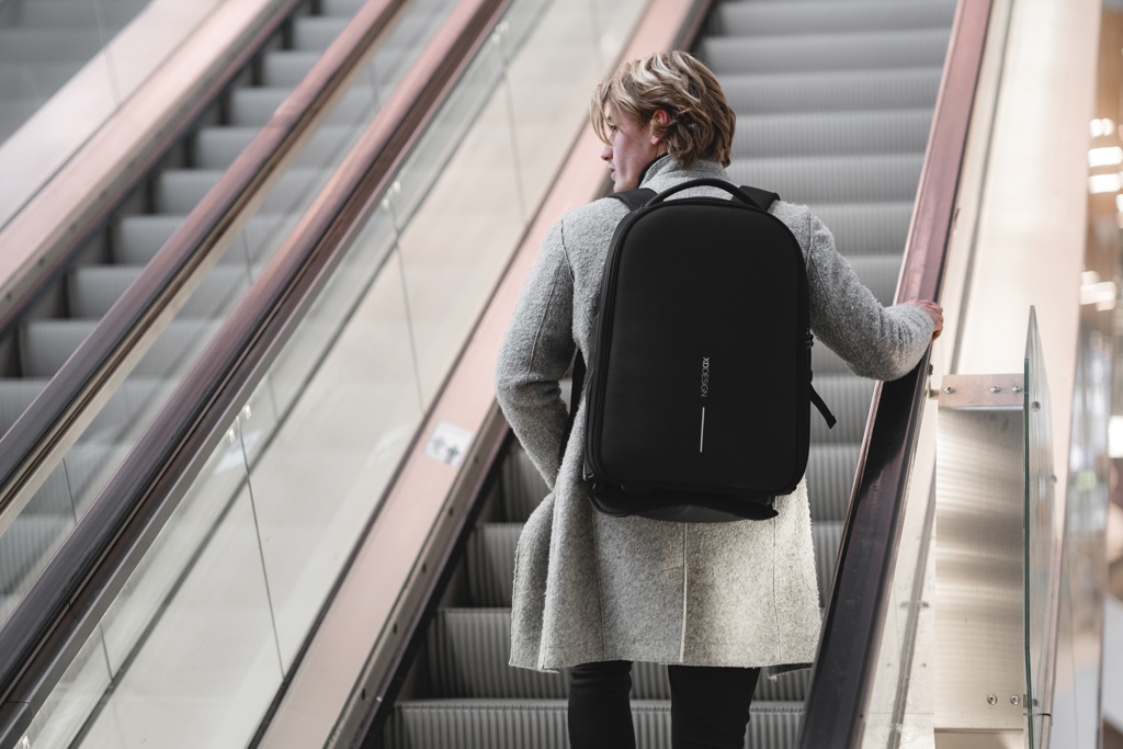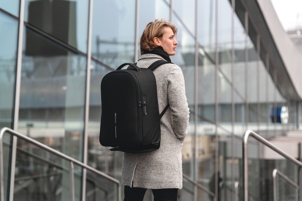 Convenient as a trolley and practical as a backpack. The Bobby backpack trolley is your ideal travel companion for short trips or daily commutes. Easily transform it from a backpack into a trolley by storing the shoulder straps in the back panel and releasing the handle. When switching into backpack mode, you can hide the handle and wrap the backpack around the wheels, keeping your back clean. The Bobby backpack trolley keeps you safe and connected with the well-known Bobby anti-theft features combined with a TSA® lock. Inside, you will find separate compartments for clothes and business devices with a quick-access laptop pocket. Made from R-pet fabric with the AWARE™ tracer. With AWARE™, the use of genuine recycled fabric is guaranteed. 19% recycled content. Registered design®
