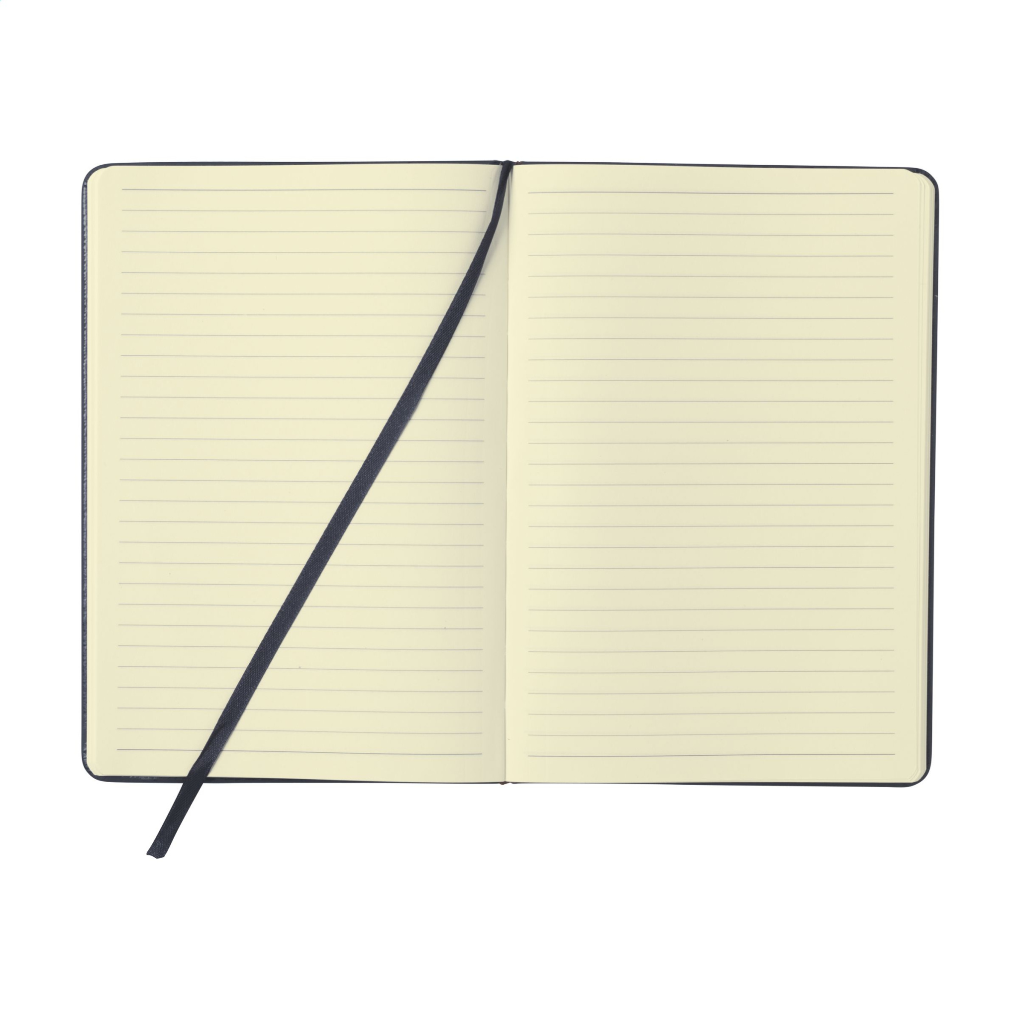 Practical notebook in A5 format. With hard PU cover, approx. 80 sheets/160 pages of cream coloured, lined FSC Mix certified paper (70 g/m²), elastic closure and ribbon marker.