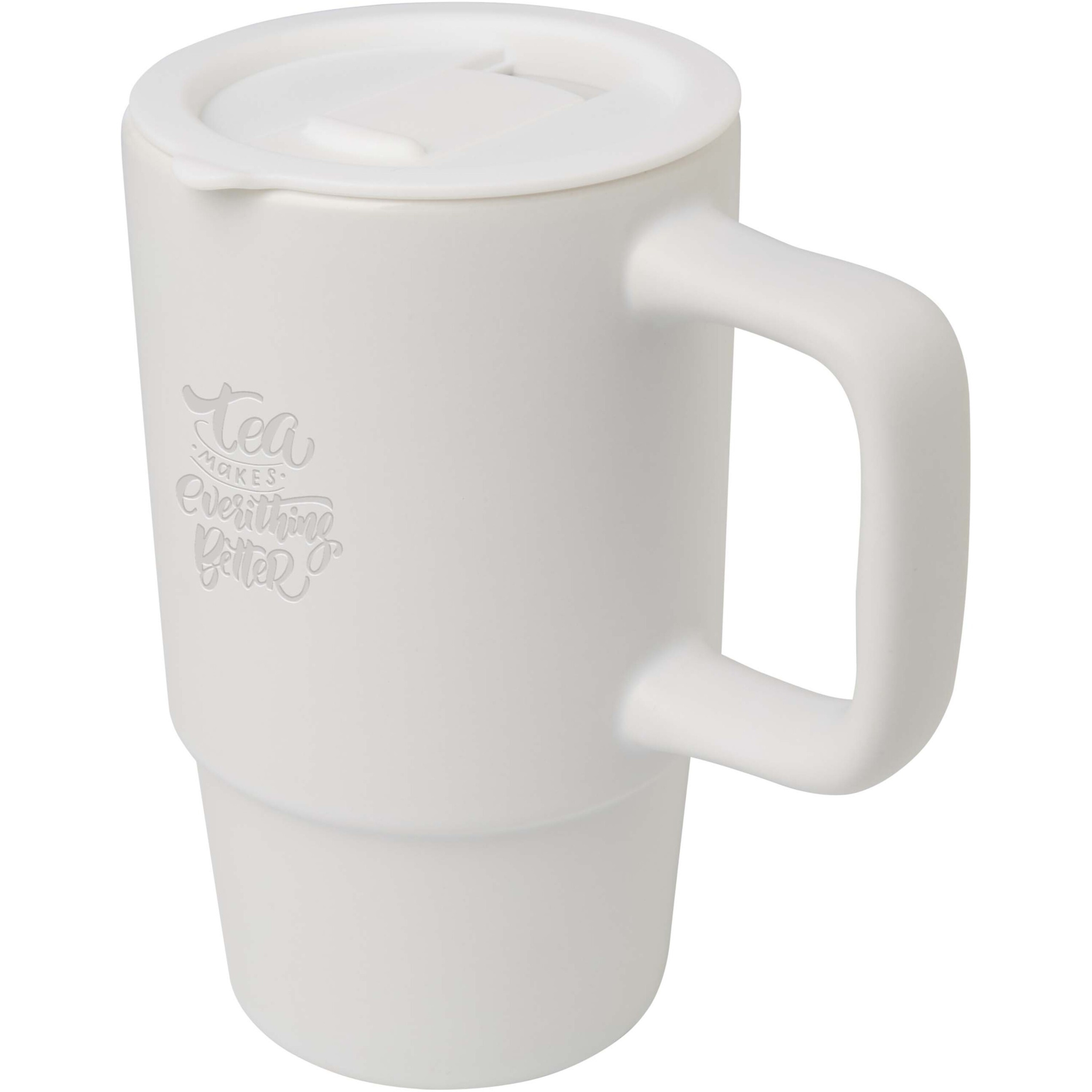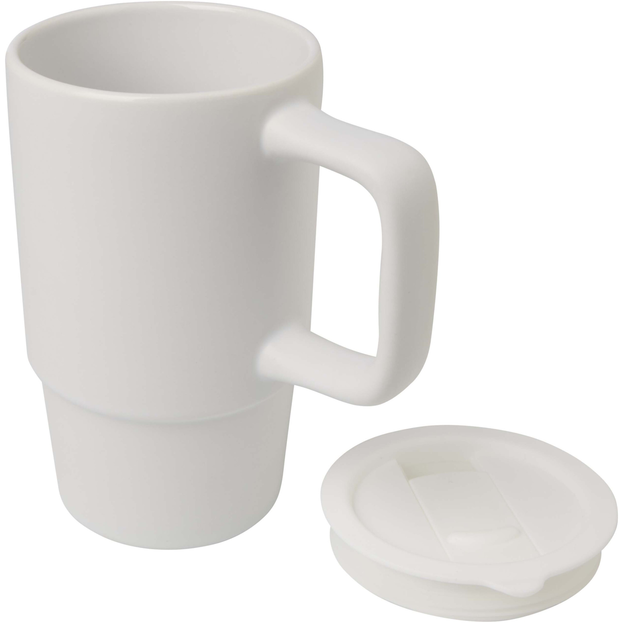 Ceramic mug featuring a large oversized handle for easy carrying, and a spill-proof plastic lid for convenience on the go. The exterior has a stylish matte finish, and the bottle is dishwasher safe for all print methods. Presented in a recycled cardboard gift box. Volume capacity: 450 ml.