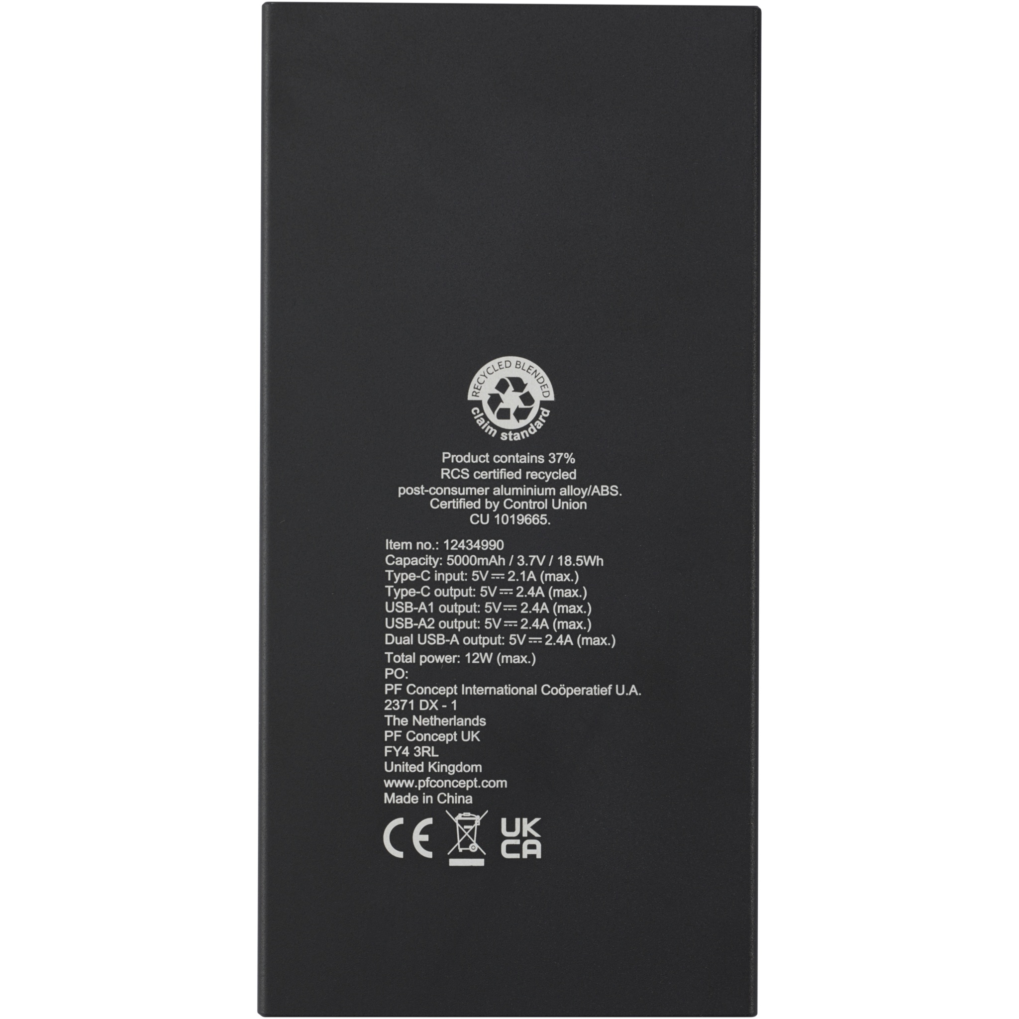 The elegant Connect recycled aluminium 5000 mAh power bank prevents you from losing power wherever you are! This high quality and slim power bank with lithium polymer battery features a Type-C input port of max. 5V/2.1A, a Type-C output port of max. 5V/2.4A, and 2x USB-A outputs of 2.4A/5V. Delivered with a user manual, a 30 cm USB-A to Type-C max 2A charging cable, and packed in a 100% recycled kraft paper box with a colourful sticker.