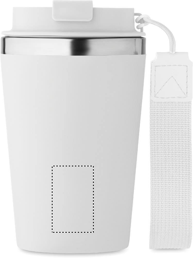 Double wall tumbler in recycled stainless steel (90% recycled stainless steel and 10% stainless steel) with recycled PP outside layer with RPET wrist strap. Leak-free. Capacity: 350 ml.