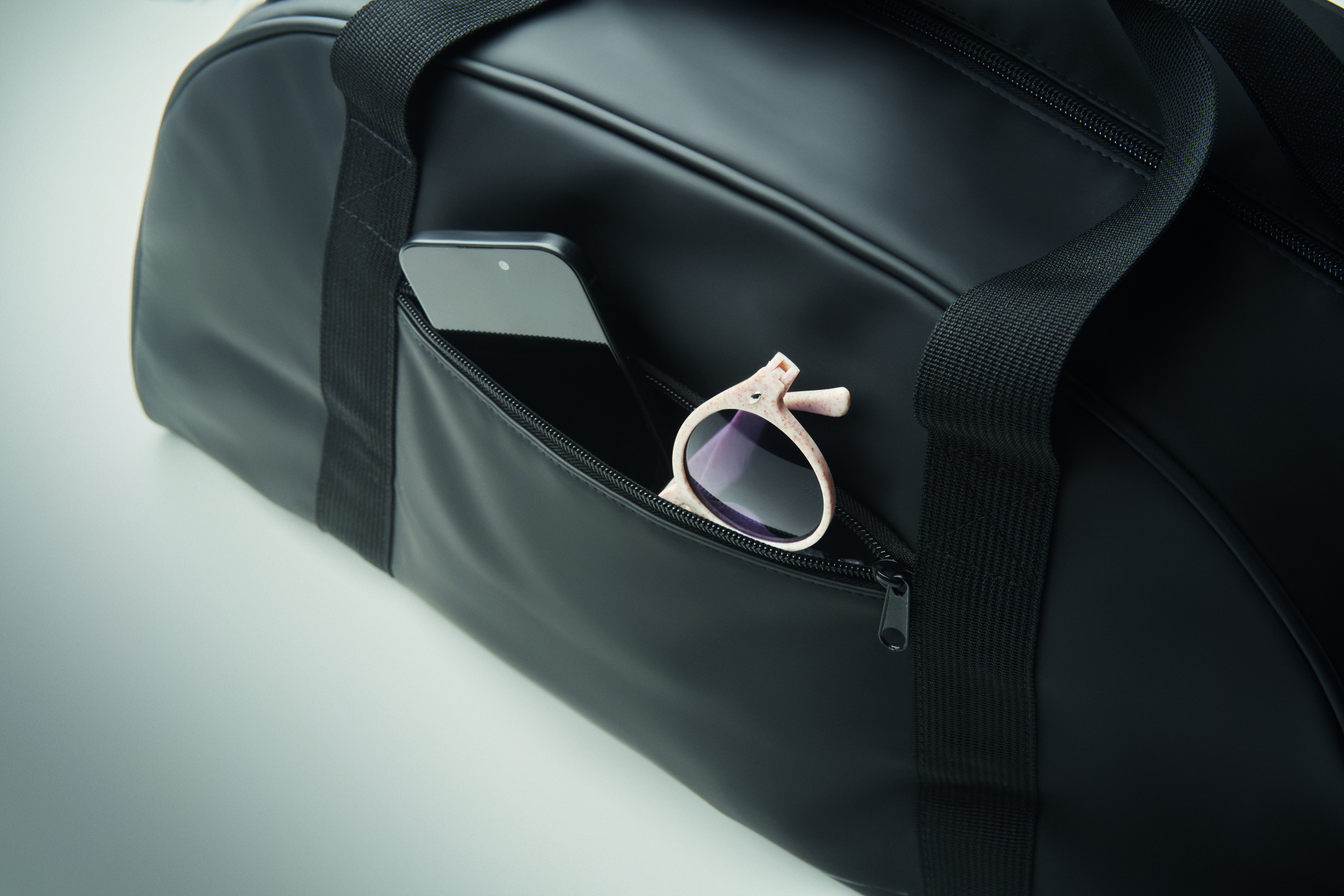 Duffle bag in soft PU with bottom foam reinforcement. One main compartment, zippered front pocket and zippered inner pocket. 210D RPET polyester lining. 2 handles and one adjustable and detachable shoulder strap