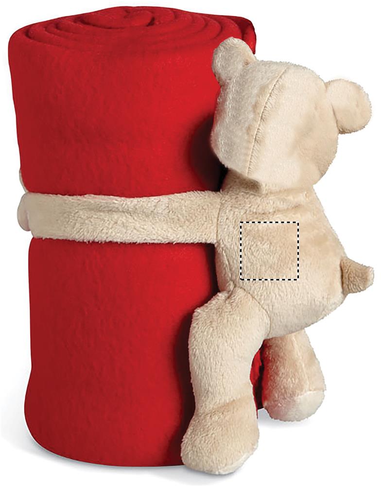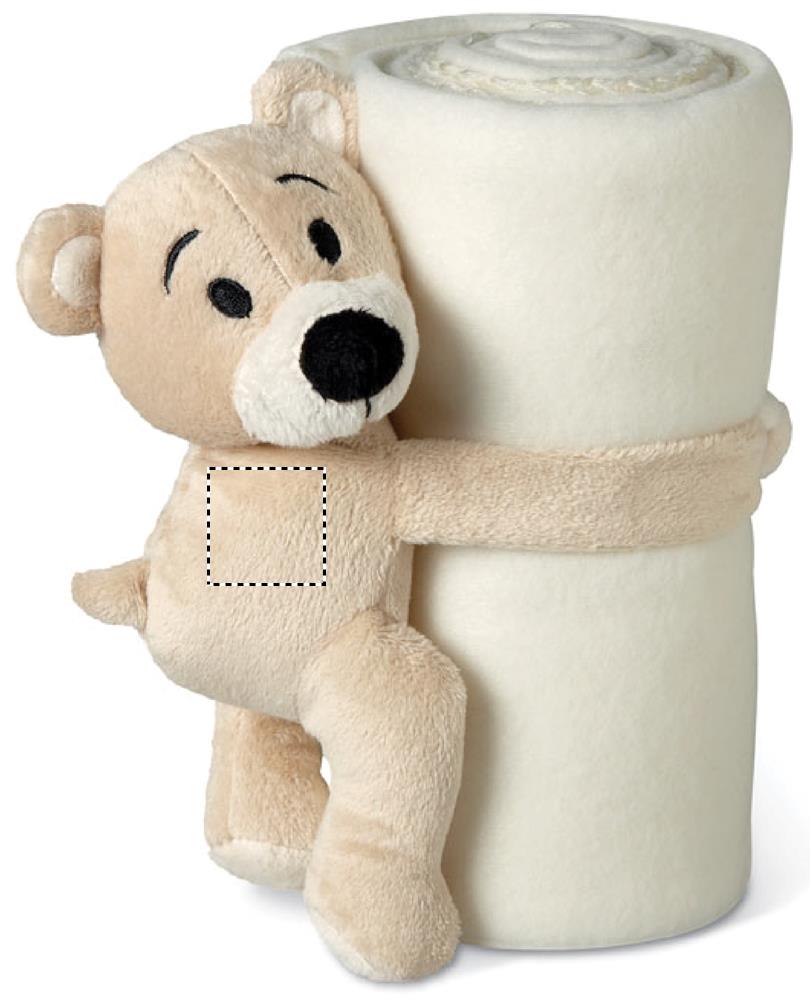 Children's fleece blanket with teddy bear toy holding the blanket with fastening tape hands.