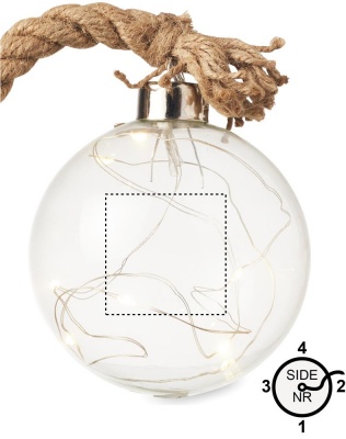 Glass bauble (Ø 8 cm) with string of 8 LED warm yellow lights and jute cord. 2 AA batteries excluded.