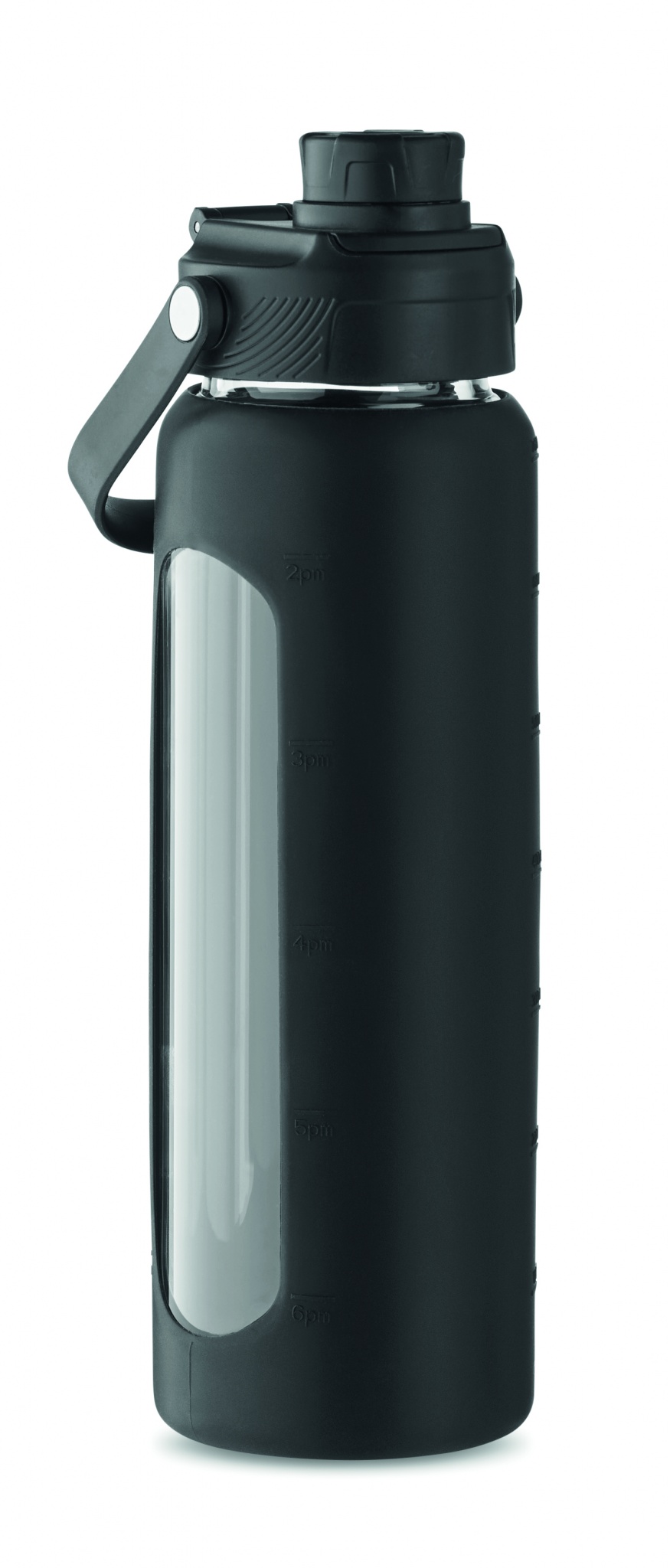 High borosilicate glass bottle with silicone see-through sleeve with PP lid with carry handle. Leak-free. Capacity: 750 ml.