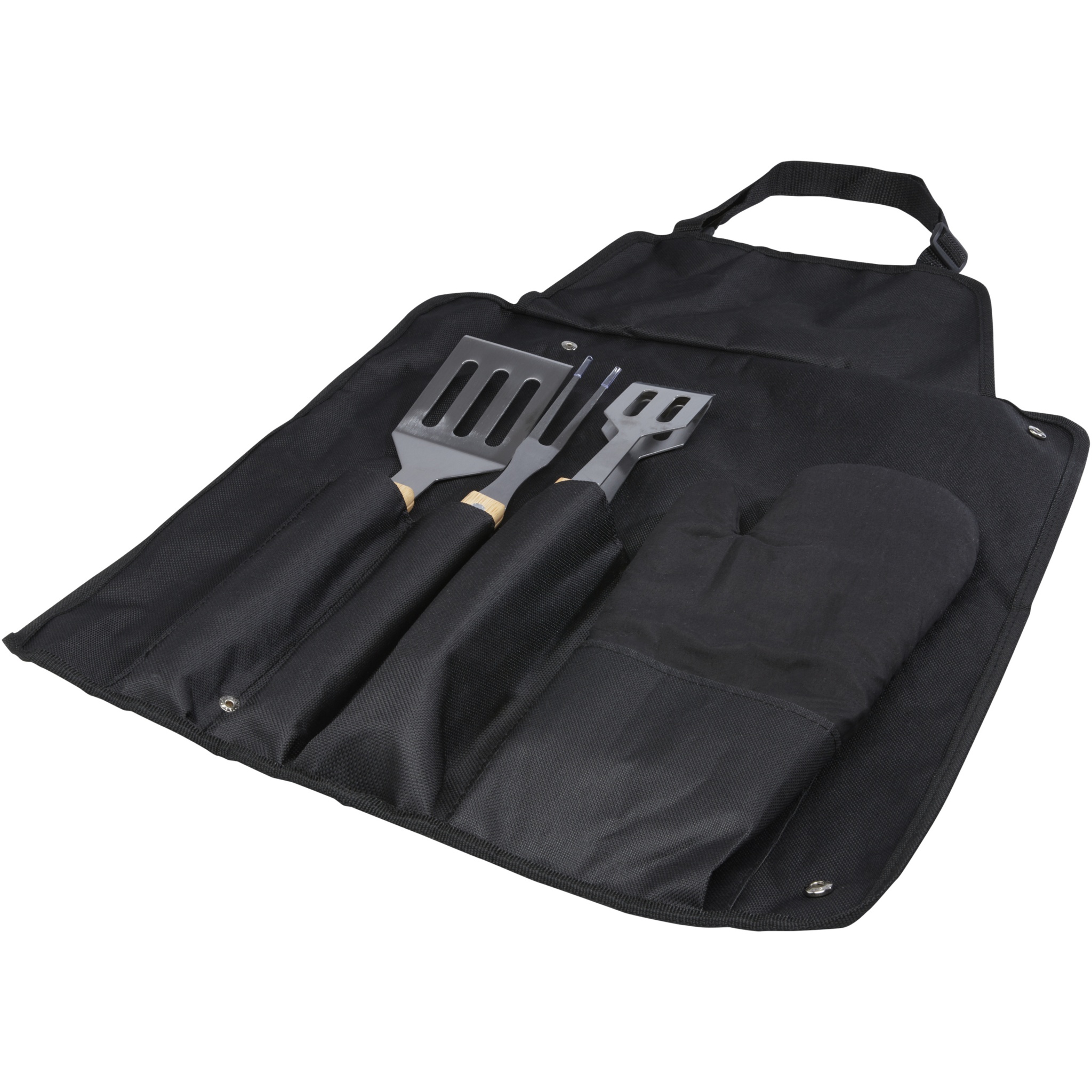 5-piece BBQ set with a shovel (36.5 x 7 cm), fork (36.5 x 2 cm), tong (36.5 x 5 cm), glove (25 x 16 cm), and an apron including pouch (42 x 60 cm). The handles are made of bamboo that is sourced and produced following sustainable standards.