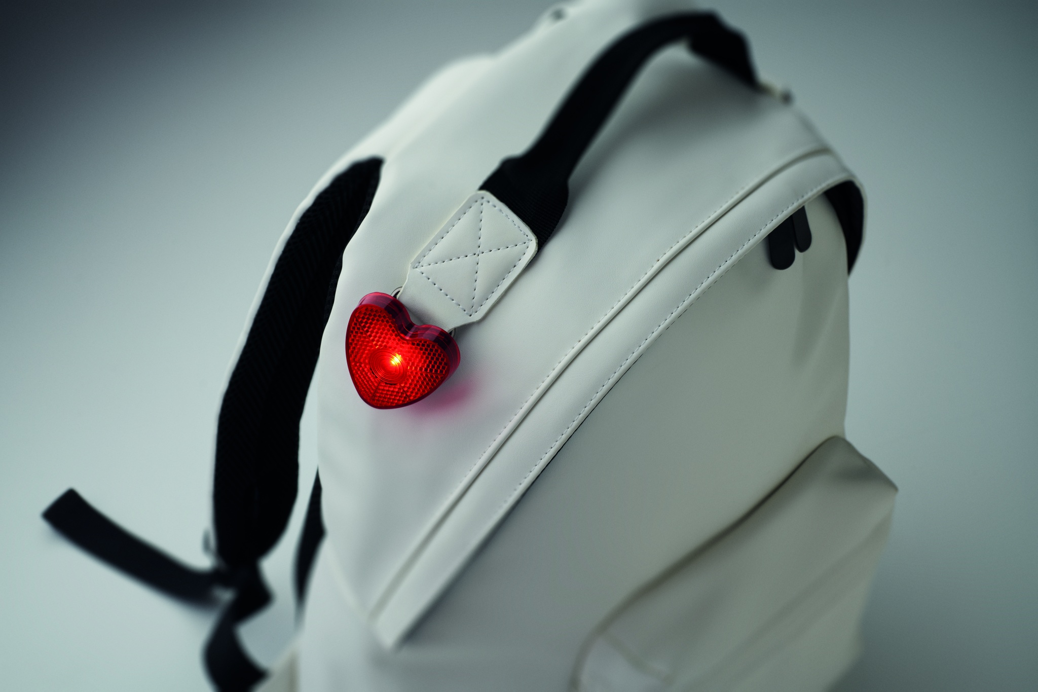 Heart shaped reflector red light in ABS with back clip. Two light modes: bright light / flashing light. Including 2 LR44 replaceable batteries.