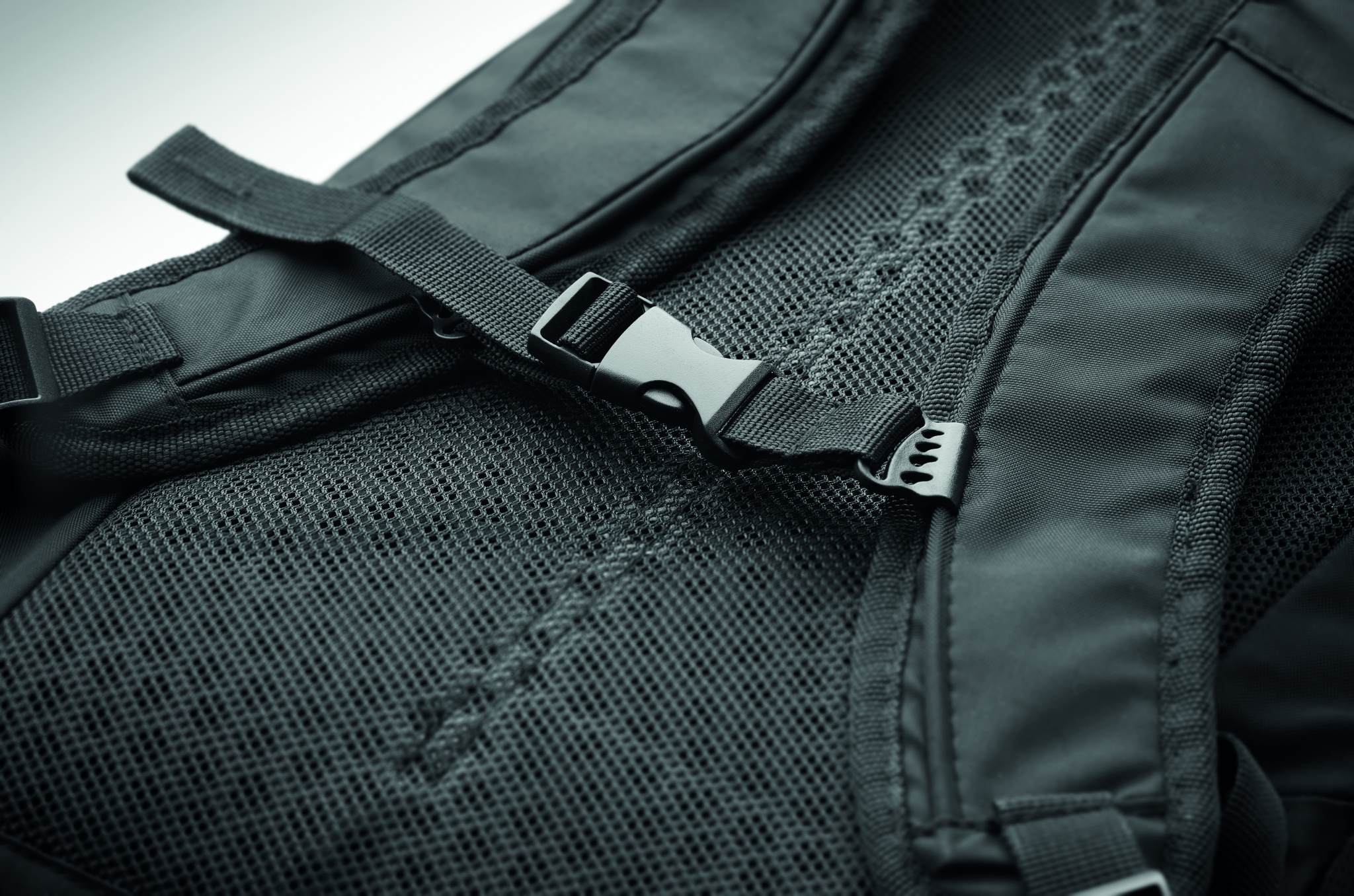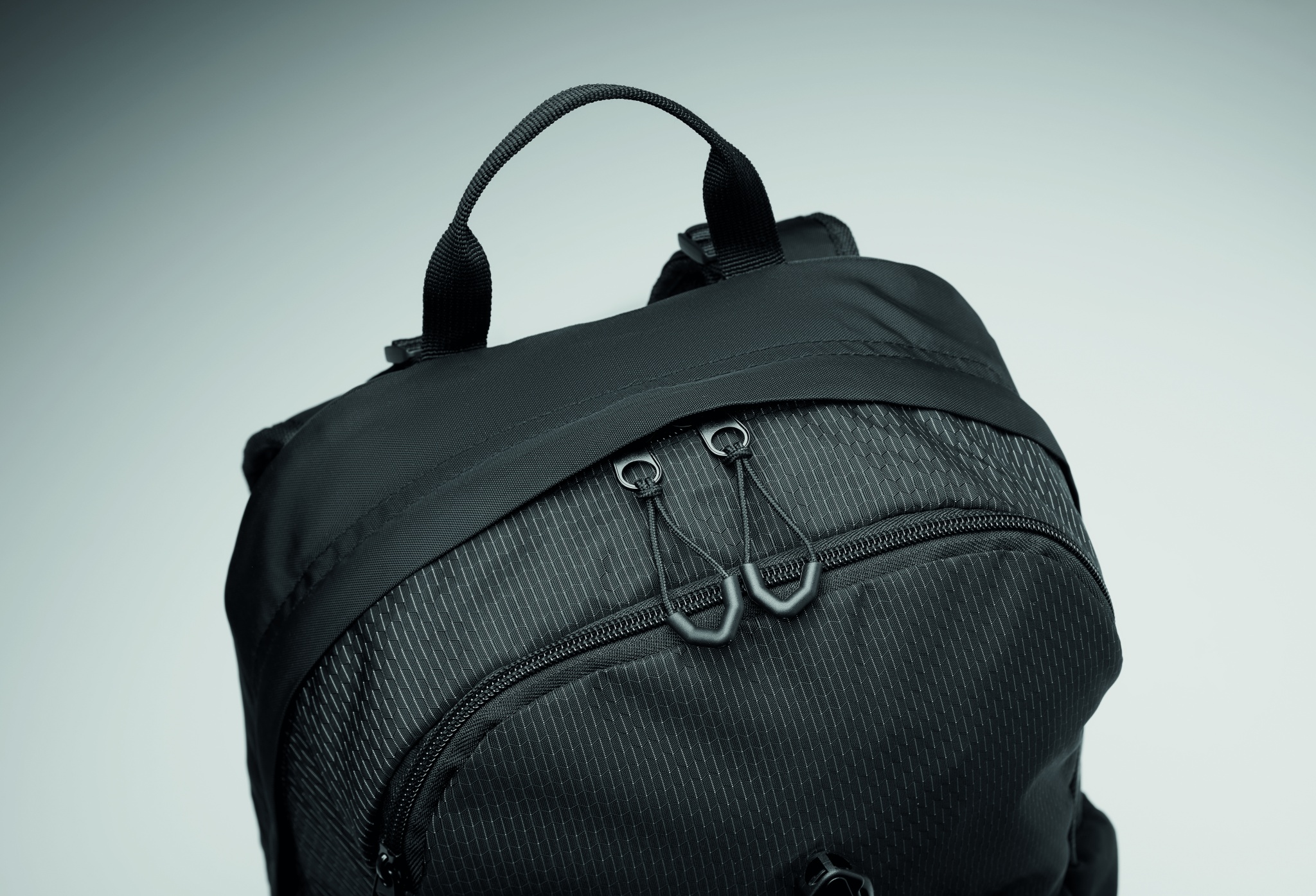 Hiking backpack 18L in water repellent 420D nylon with reflective stripe. It has a 15 inch laptop compartment. One front zippered compartment and one front slide pockets with buckle closure. Two side slide pockets. Padded back and shoulder straps. Ventilated back side.