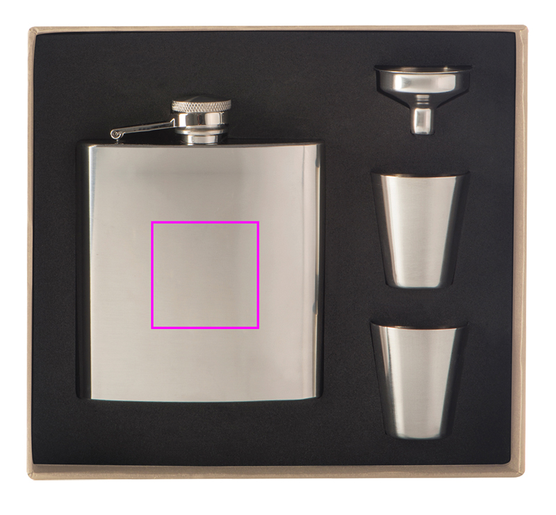 Beautiful set consisting of a hip flask (capacity 170 ml), two shot cups and a funnel, made of stainless steel. Your logo will be lasered on the hip flask.