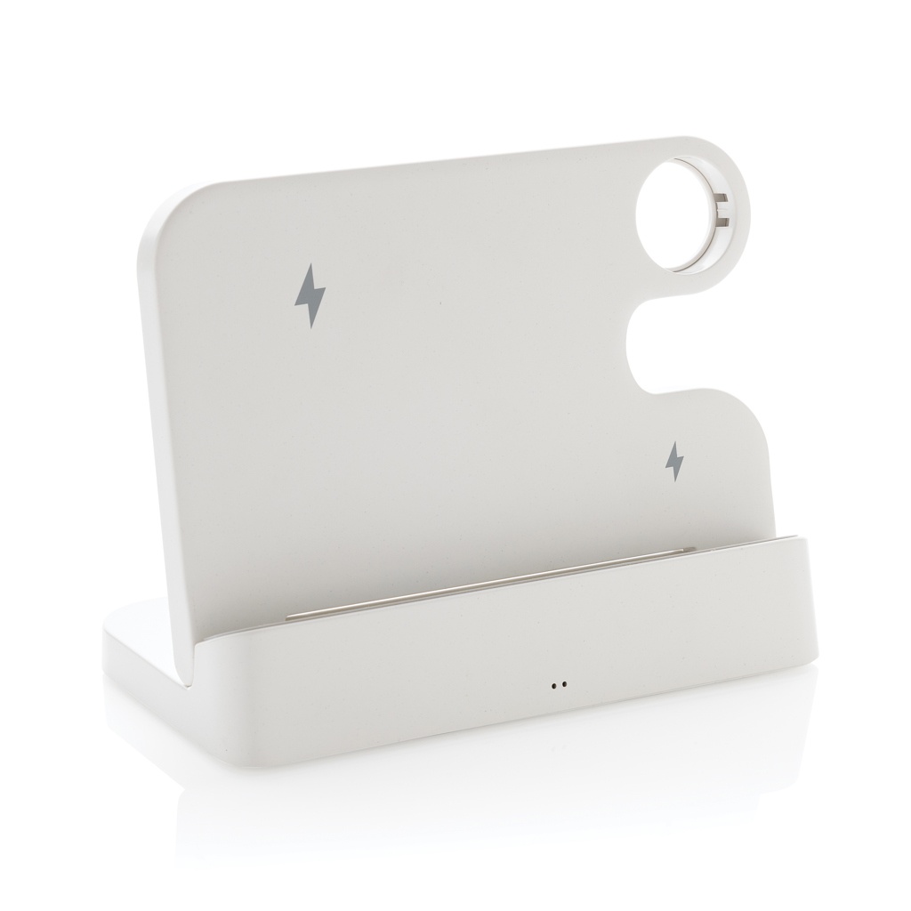 Foldable design charging stand with 15W wireless charger made with recycled ABS. With second 5W wireless charger to charge smaller objects like earbuds. With iWatch slot to fit the official charging cable for iWatch. On the backside there is a 5V/1A USB A and USB C output port to charge items by cable. With silicon tips on the bottom to avoid slipping and silicon cushioning to the stand to keep your phone in perfect condition. Total recycled content: 80% based on total item weight. RCS certification ensures a completely certified supply chain of the recycled materials. Packed in FSC® packaging. PVC Free. Including RCS recycled TPE 120cm USB A to USB C charging cable. Packed in FSC® packaging. PVC Free