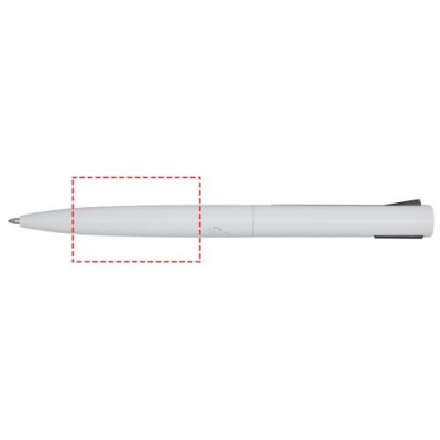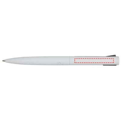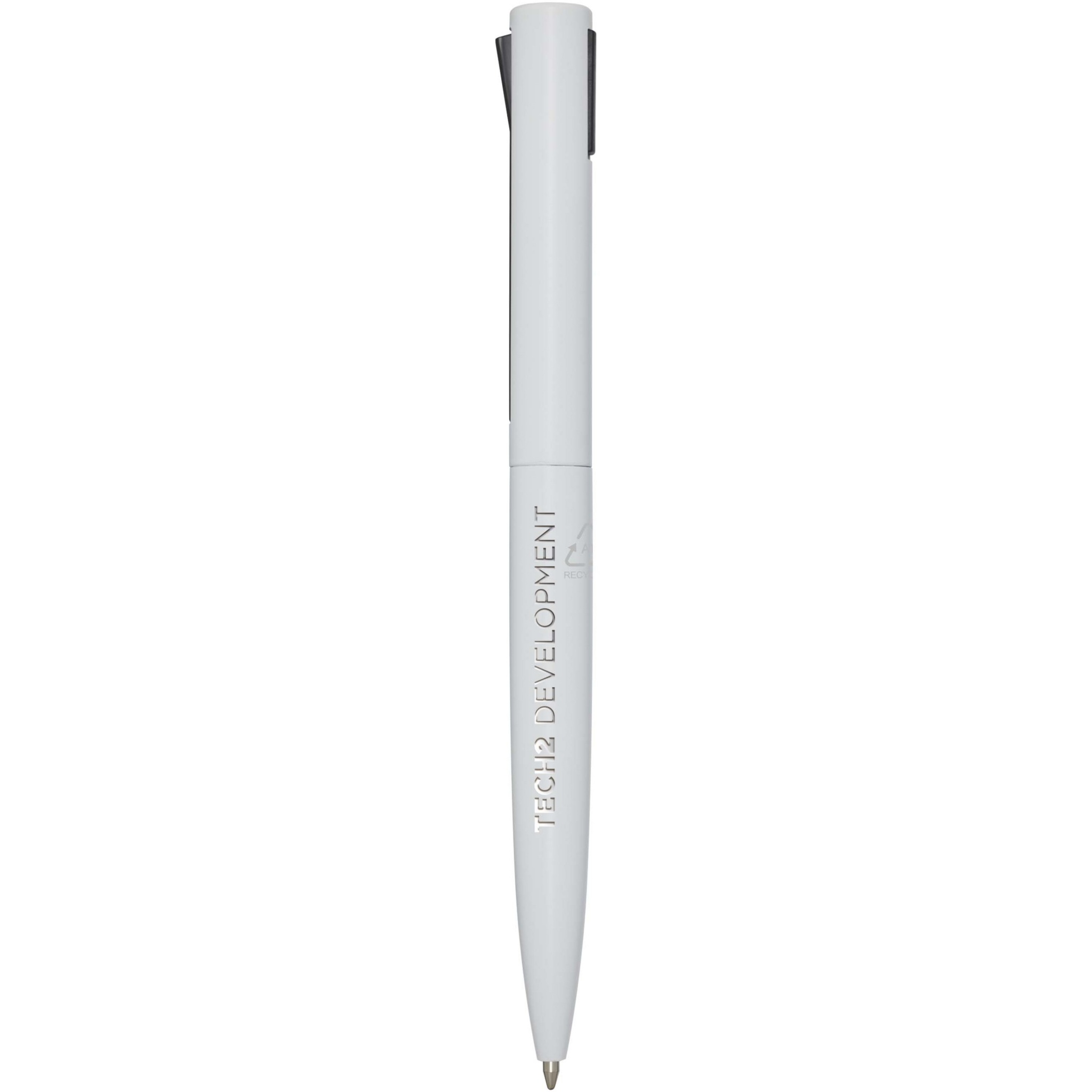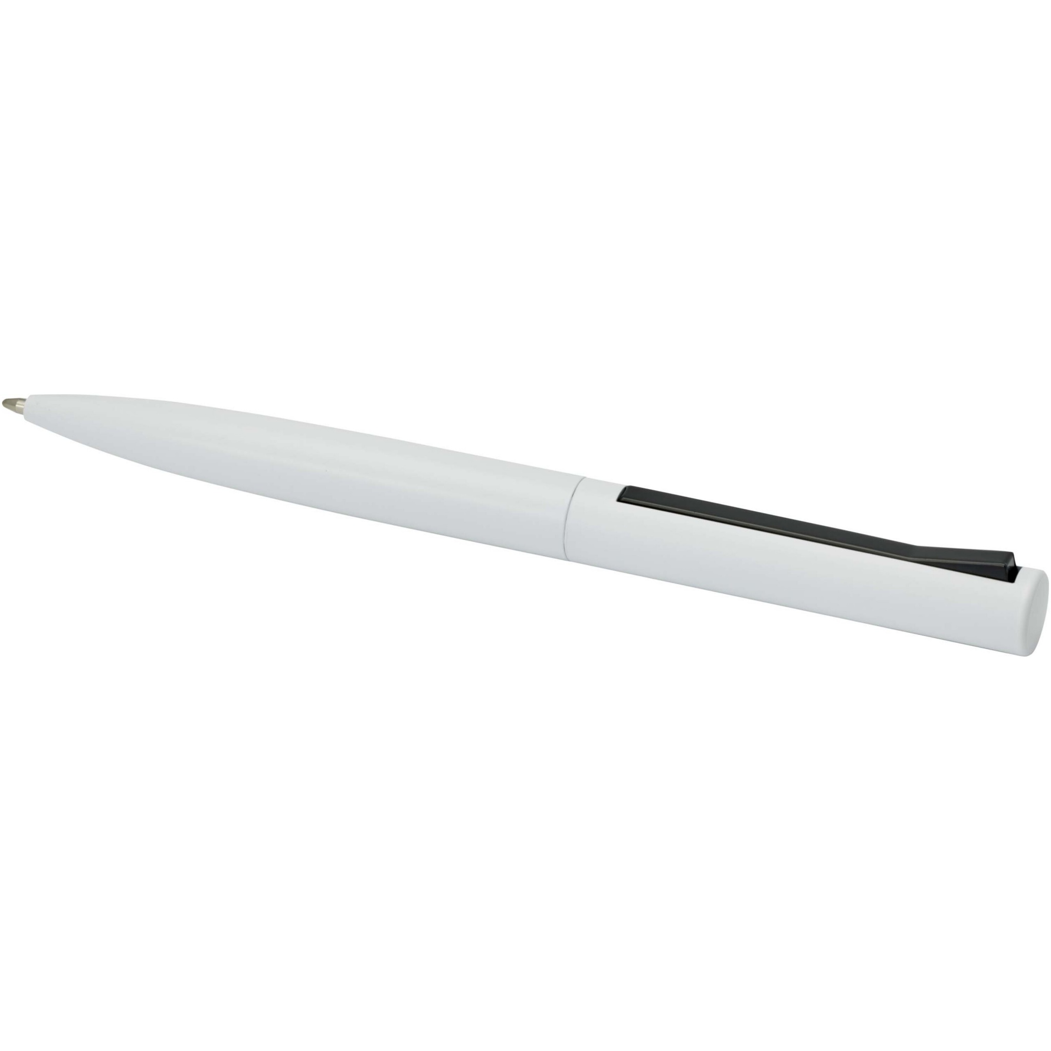 Ballpoint pen with the upper barrel made of recycled plastic, and the lower part is made of recycled aluminium. The clip is made of iron. Ink colour: Black. Writing length: 1000 metres. Nib size: 1.0 mm.