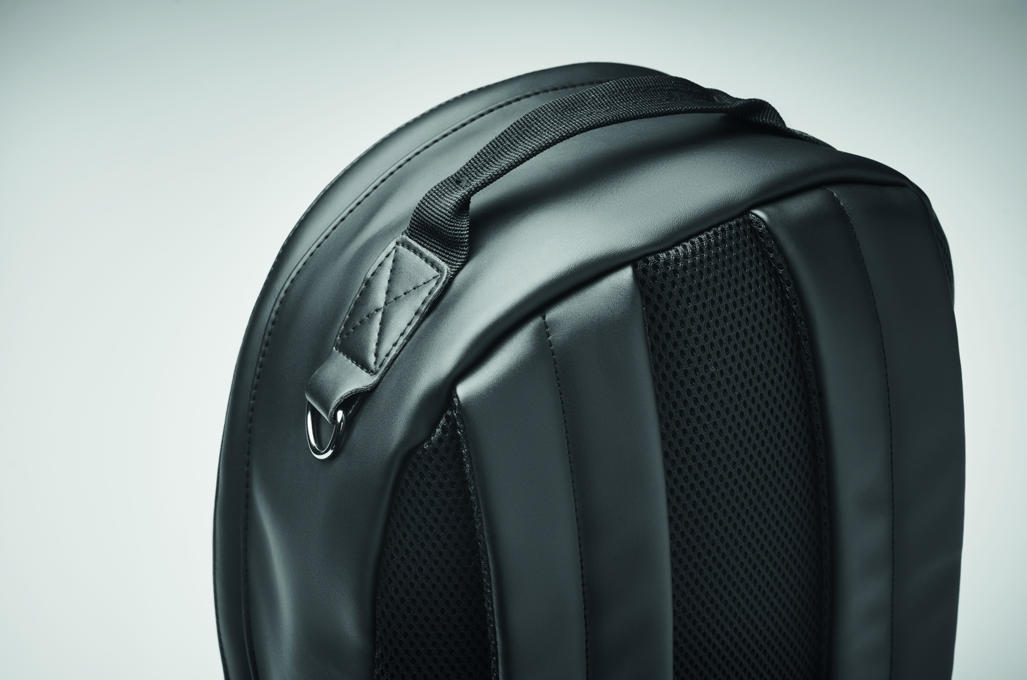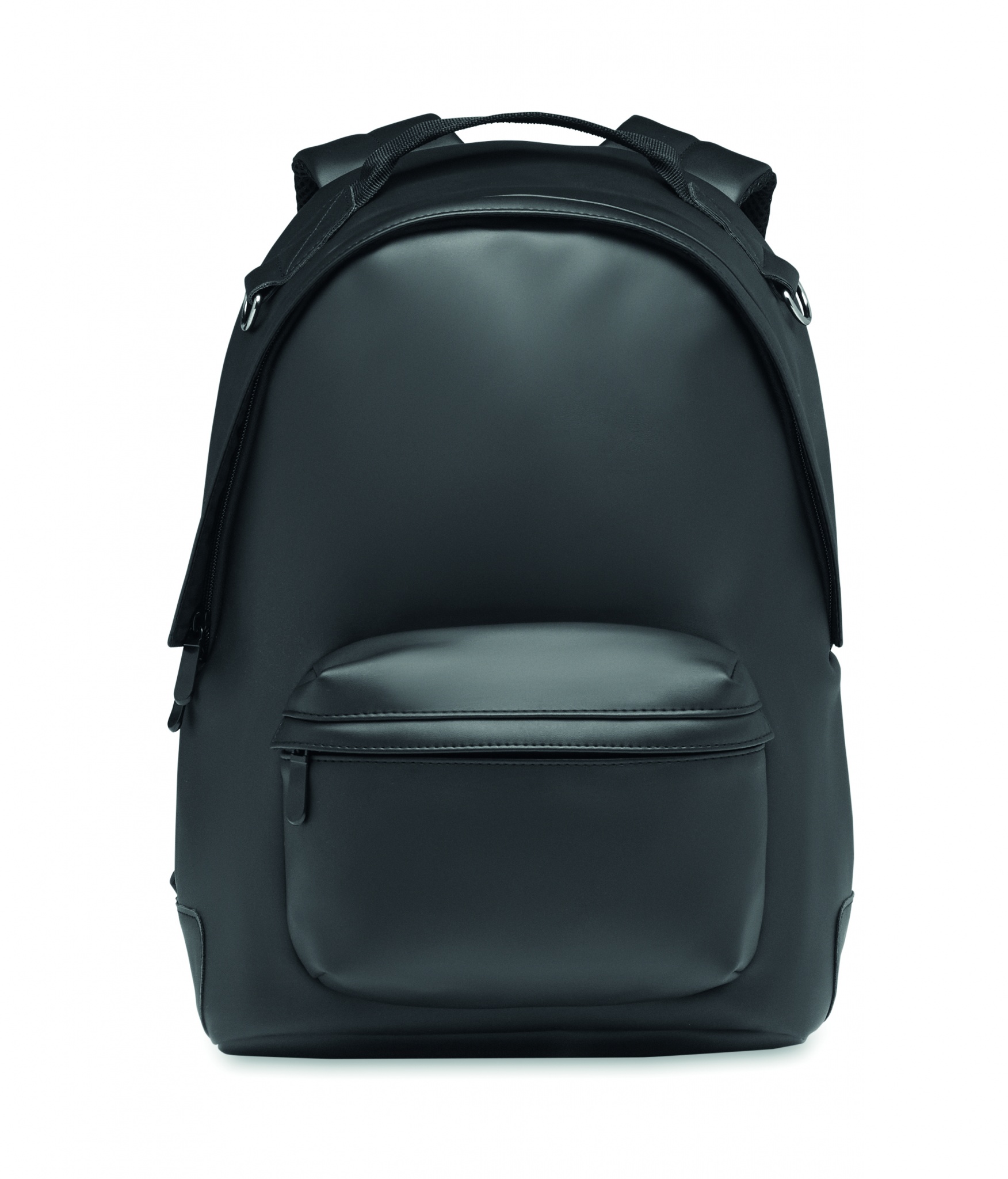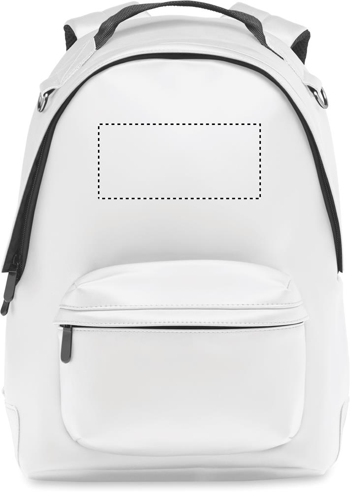 15 inch laptop backpack in soft PU with padded back and reinforced base. Front zipped pocket. The lining is 210D RPET.