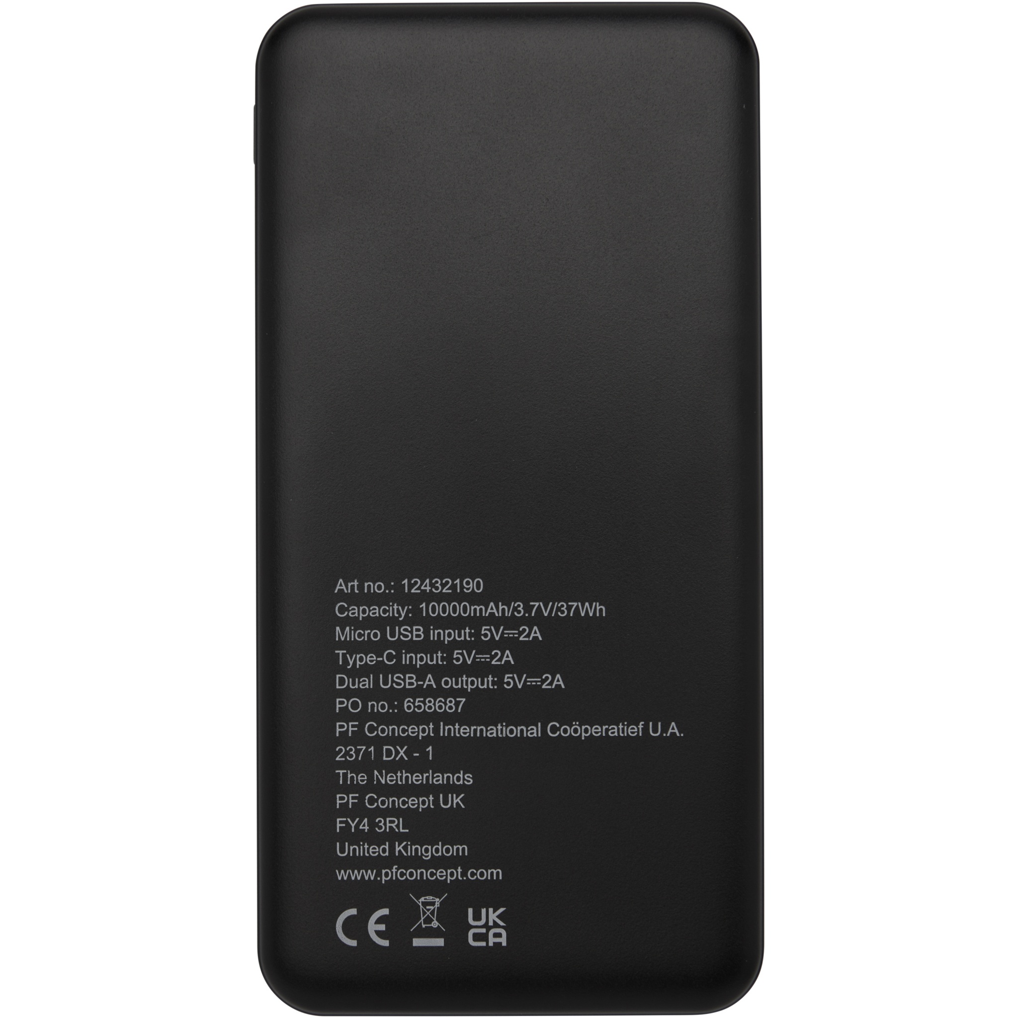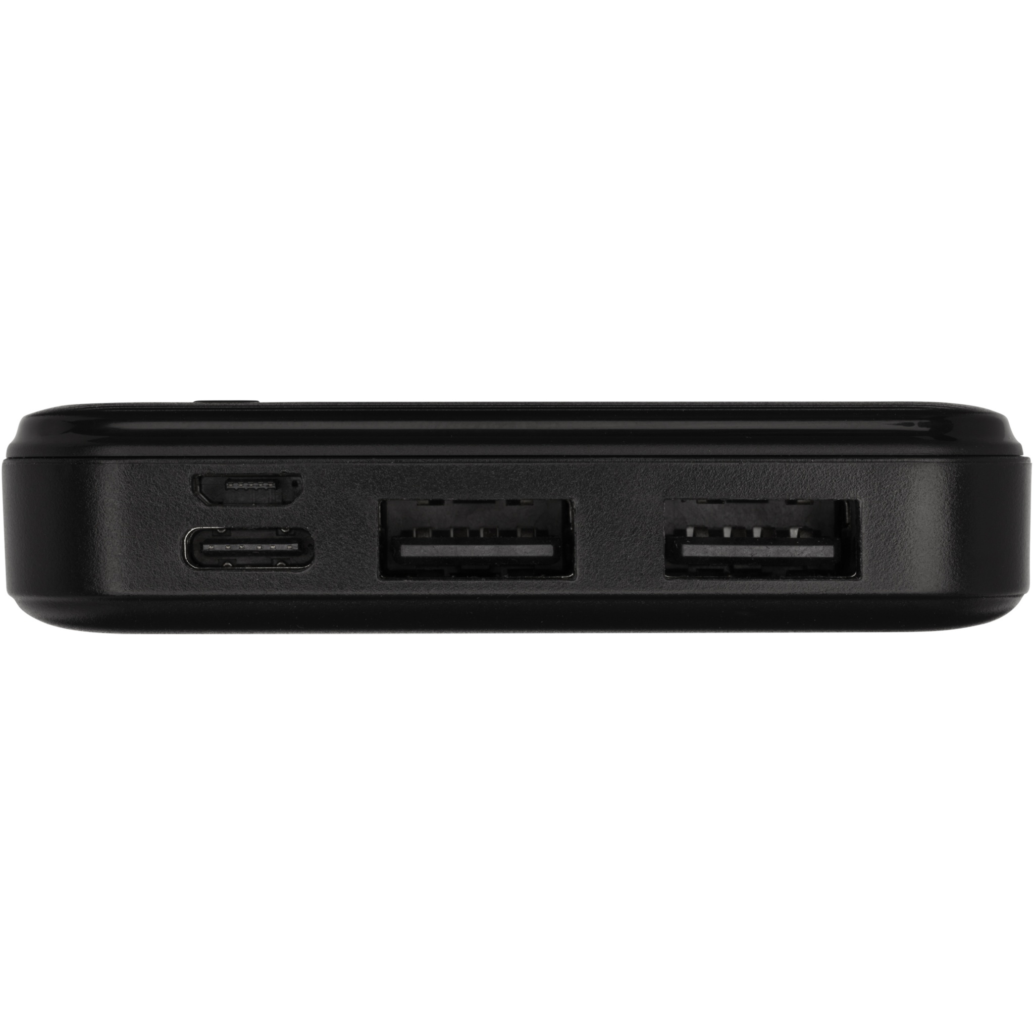 Power bank made of recycled ABS plastic. The power bank contains a long lasting grade A 10.000 mAh lithium polymer battery for fast charging. The power indicators will indicate the remaining energy level so you always know when to recharge. Type-C input 5V/2A, Micro USB input 5V/2A, dual USB-A output 5V/2A, total power 10W. Delivered with a 30 cm TPE 2A USB-A to Type-C charging cable, an instruction manual and a kraft paper gift box.