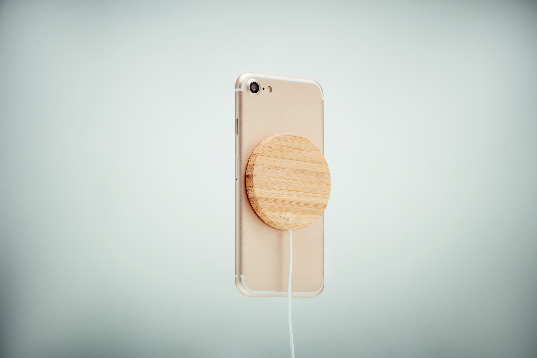 Magnetic bamboo wireless charger. Output: DC 9V/1.1A (10W) for quick charging. Compatible with iPhone® 12 and newer. Including additional magnetic metal ring to support charging of other non-magnetic wireless chargeable phones. Bamboo is a natural product, there may be slight variations in colour and size per item, which can affect the final decoration outcome.