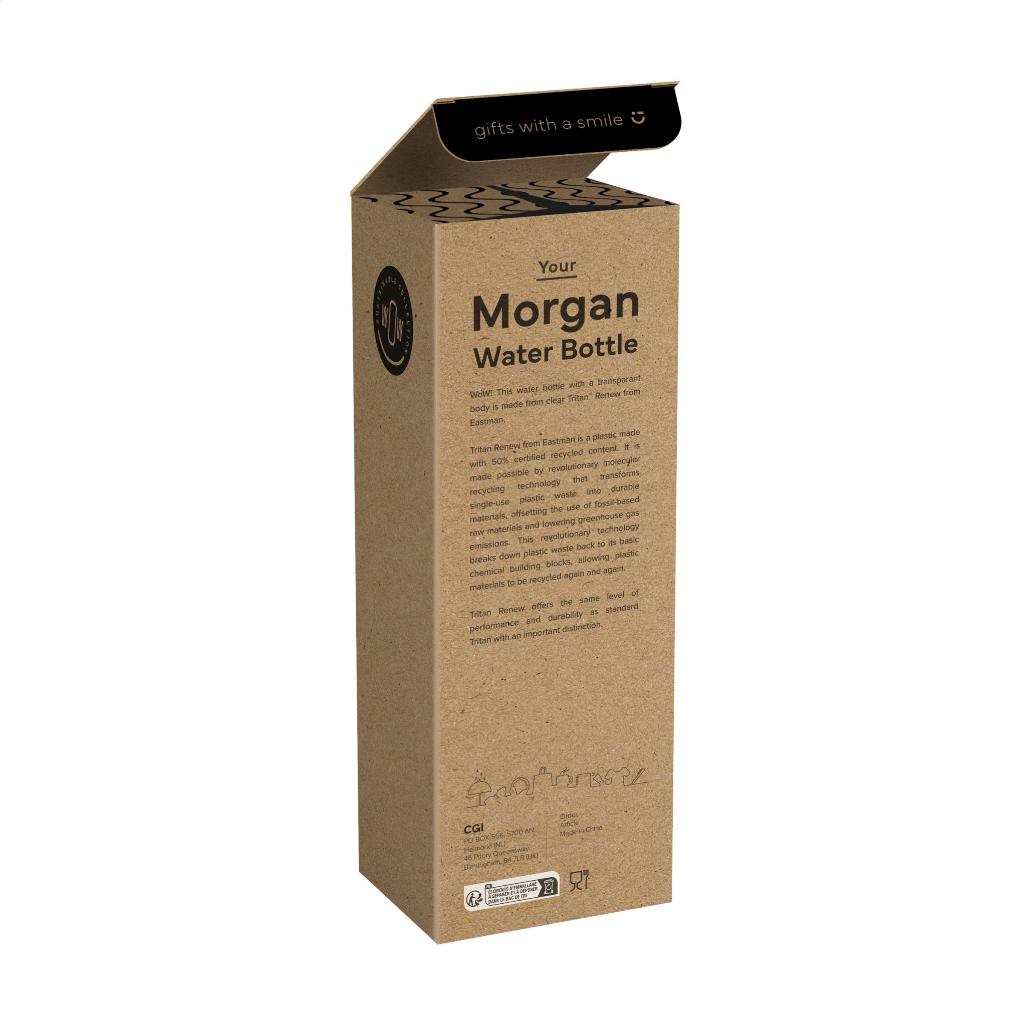 WoW! Water bottle with a transparant body made from clear Tritan™ Renew from Eastman. With 50% recycled material without compromising quality. The screw cap has a collapsible mouthpiece and sealable straw, allowing you to keep your head straight while drinking. This way you can take a sip whilst also keeping your eyes on the road while driving. This bottle is easy to carry with one finger. Reusable, leak-proof and BPA-free. Capacity 650 ml. Each item is supplied in an individual gift box.