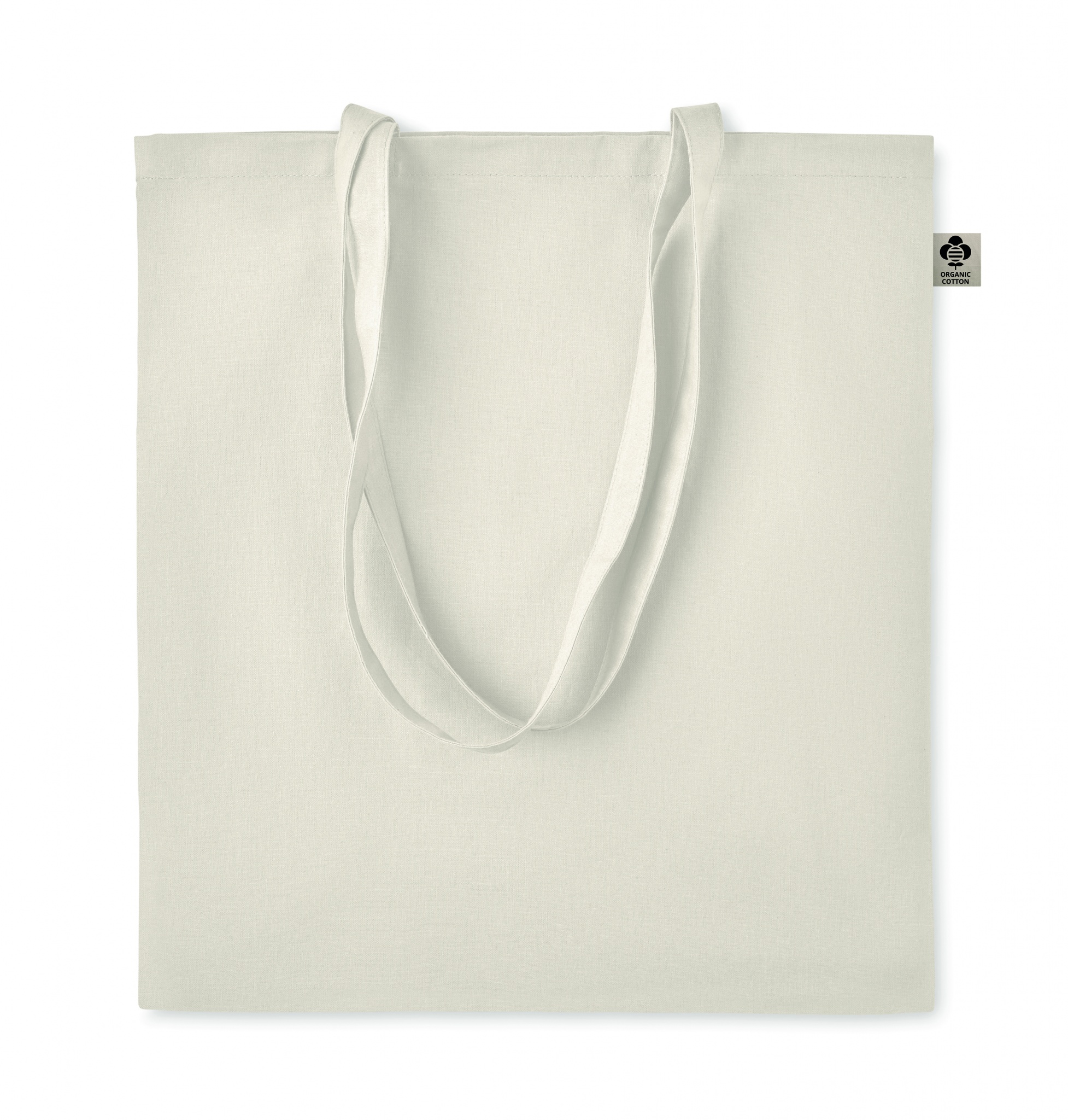 Organic cotton shopping bag with long handles. A classic tote bag design made to carry your daily groceries or other items. Carry the bag in your hands or over your shoulder with the long handles. Made from 100% natural organic cotton 140 gr/m².